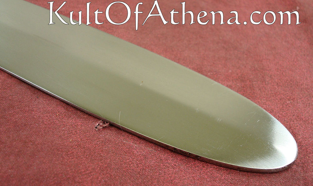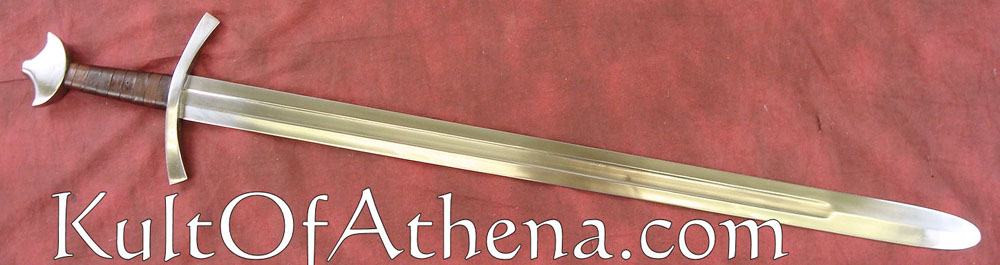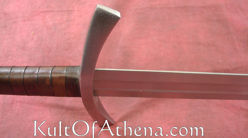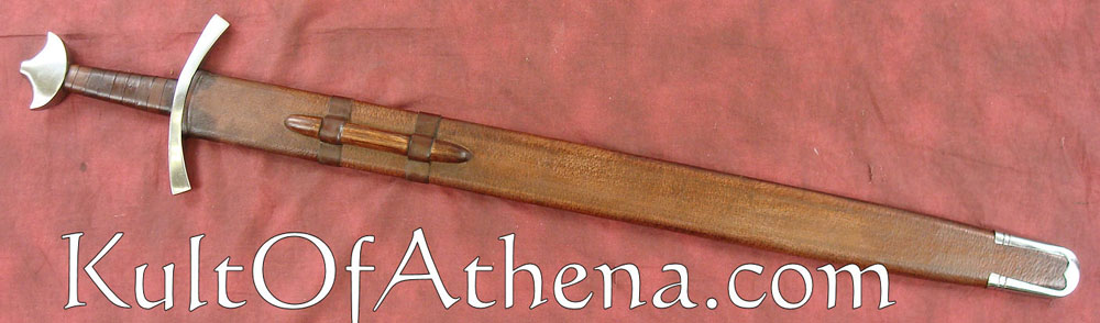 The blunt blade is made from high carbon steel. The crossguard and pommel are likewise of steel. The grip is tightly wrapped in spiralled brown leather. It comes with a wood-core scabbard covered in brown leather with an integrated wooden suspension loop and steel chape.