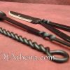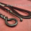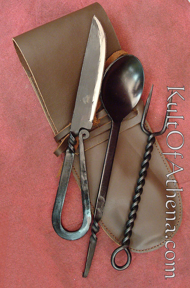 This eating set is blacksmith forged in blackened stainless steel to minimize maintenance. The knife has a thin and slightly sharpened edge. Supplied in an attractive leather pouch with a belt loop, these period utensils are made to be used and work well.