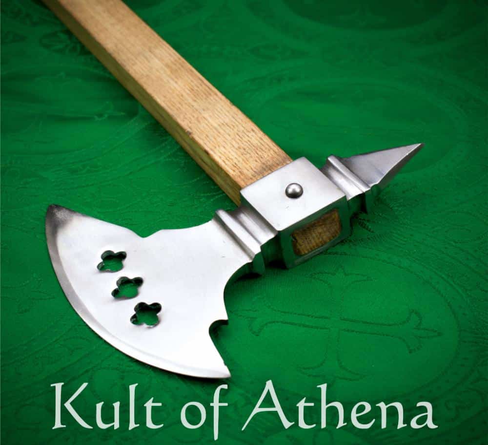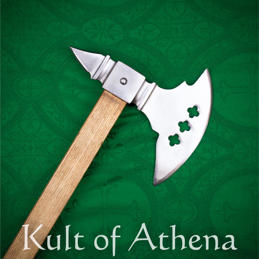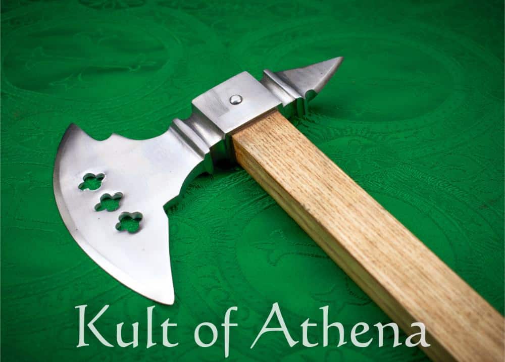 The Medieval War axe is a light battle axe suitable for single hand use. The head is made of solid carbon steel with cross shaped cut outs on the blade and an armor piercing back spike. The head is secured to a squared hardwood shaft and a steel pin runs through the shaft for extra security. Unsharpened.