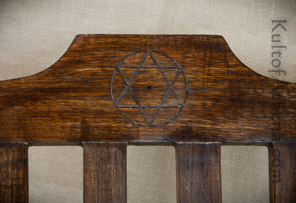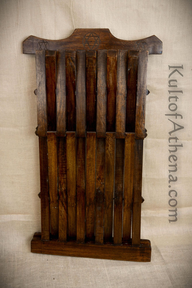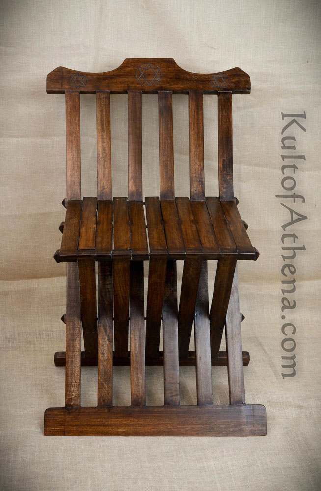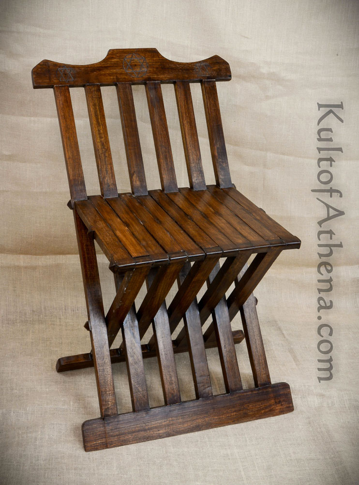 This medieval folding chair is handcrafted from wood; it has internal pins which allow it to fold flatter for easier storage and transportation. The ends of the internal metal pins are cleverly disguised with wood pyramidal caps. Three mystical Seals of Solomon are hand-etched onto the top rail.