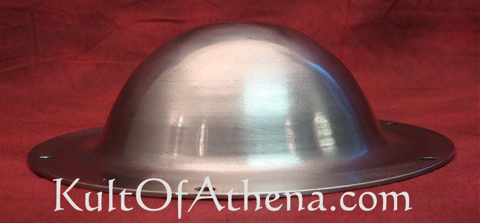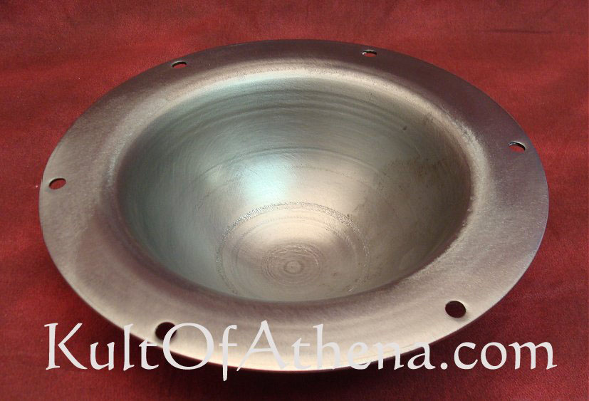 Medium Shield Boss- 14 Gauge Steel Every member of Draugar Vinlands uses one of these bosses on their shield. None of them have ever failed. They are well made and they are thick enough to offer very good protection against weapons piercing the shield and hitting your shield hand. The design is simple and there are many examples of this style, and size of shield boss being found in archaeological digs. When the boss comes to your door it will be oiled very shiny and packed in bubble wrap. I usually flame blacken my boss by leaving it in a fire for about ten minutes and then pulling it out with tongs and fast quenching it in a bucket of water. When you pull it out of the water using the same tongs it will be an iron grey blue color. You can also use “Gun Bluing” solution to get the same effect but I prefer to stay away from the hassle of using chemicals. This Product gets the Jarl seal of Approval and the approval of the rest of the Vikings in my group. Hail to Kult of Athena for yet another great product!