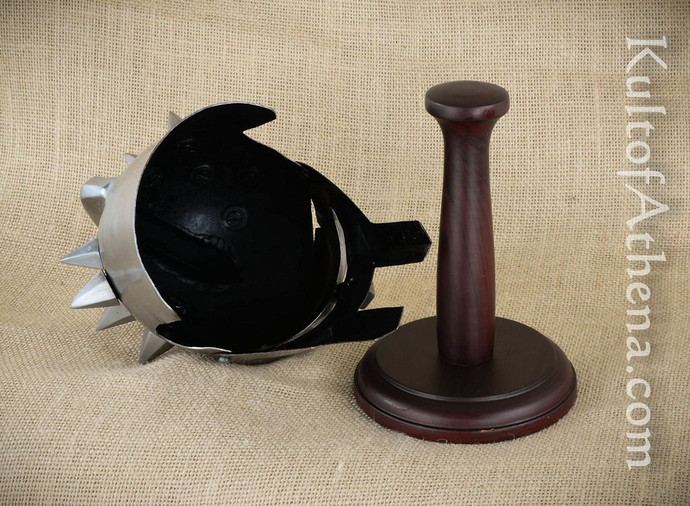 This miniature Gladiator Helmet makes for a great and compact display piece. It comes with a display stand so that it is instantly ready to embellish your bookshelves or to stand in unblinking vigil over your desktop. Just like its full size counterpart, this helmet is crafted from steel; the stand is wood.