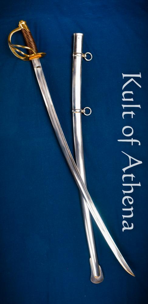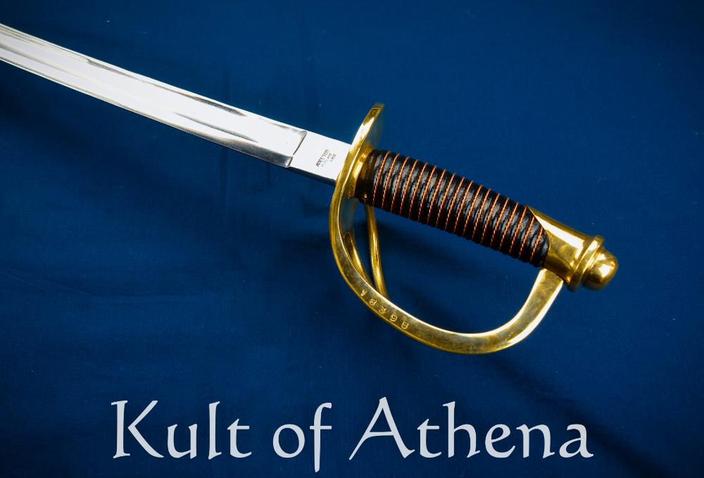 Take the cat by the tail and face the situation. This is the older of two models representations by USI. It is listed as an M1840 “ole wristbreaker”. If you look at the pictures of the ricasso you will see that the blade is marked ” US ADK 1862″. The M1840 ceased production in 1858. It was a 36×1.25 in bladed, 2.5 lb saber. THIS, my friends is actually an M1860 light cav saber, manufactured since 1858. All the India producers make the same mistake.