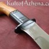 Crafted in the Philippines the sharp blade is of 5160/D2 high carbon steel tempered to HRC 58-60. The short guard and top half of the grip are of blackened metal and bottom half of the grip is of carved wood.