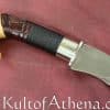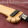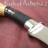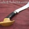 A carved wooden scabbard with a blade-retaining clip is included. The clip is a barrier to the blade that can be bypassed with a good push to insert the blade and a good tug to free it. The blade can be drawn straight up instead of the standard pull out due to the scabbard being open on its back side.