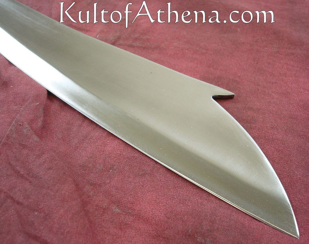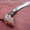 The Utak is one of the quick, chopping swords favored by the Moro warriors and pirates of the Southern Philippines. This surprisingly lightweight and agile blade has a wide chopping blade and a unique, sharp thrusting tip. This Utak is made in the Philippines and has a sharp blade of 5160/D2 high carbon steel tempered to HRC 58-60. The short guard and ferrule are of steel and the grip is of exotic hardwood with two tightly-wrapped bands of cord.