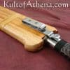 A carved wooden scabbard with a blade-retaining clip is included. The metal clip locks the blade in place by going over the lip of the guard. It can be released by a good tug on the grip.