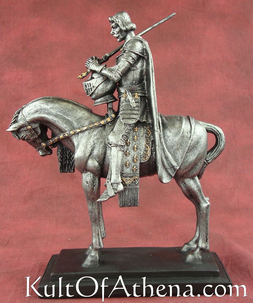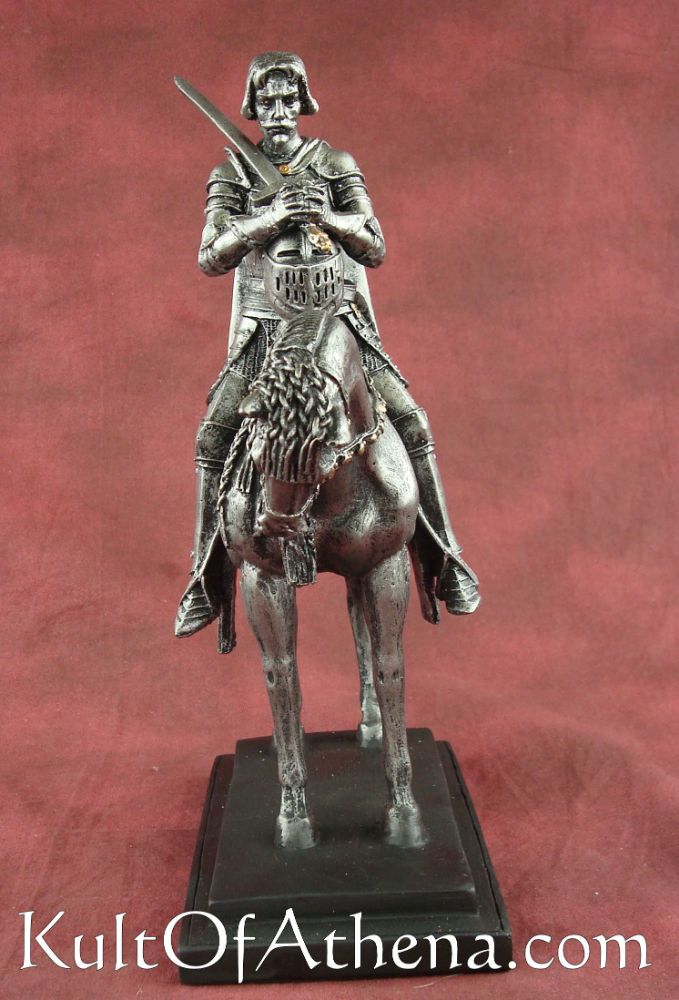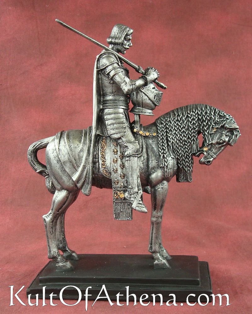 This mounted knight statue is made of cold cast resin in a pewter finish.