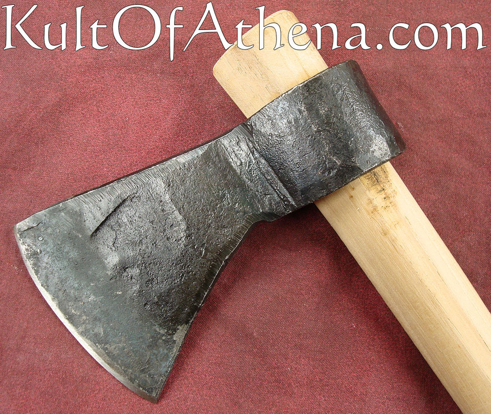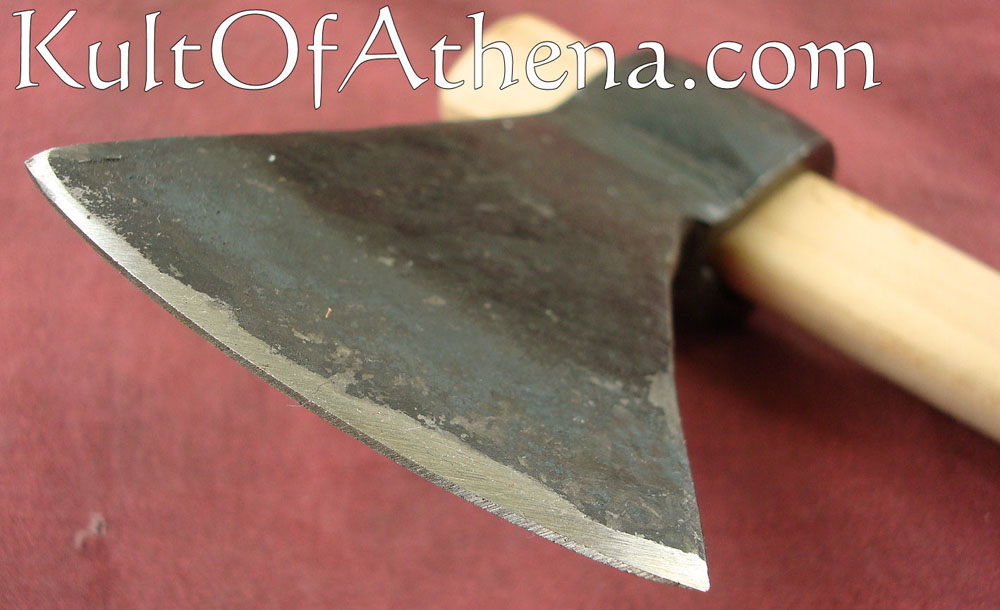 This small, unsharpened tomahawk is made from forged carbon steel and is mounted onto a wooden shaft.