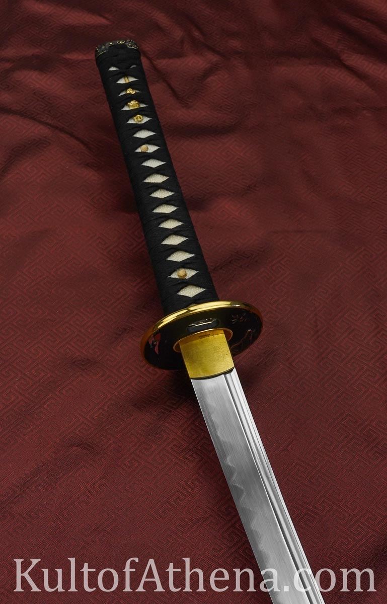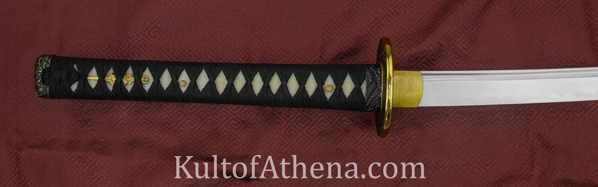 The Kaigan Katana by Musashi is a visually striking Katana with a sharpened cutting blade to match. The forged blade is crafted from 1060 high carbon steel which was differentially tempered with the traditional claty-tempering process to give it a hardened steel edge and a visual hamon line. A long bo-hi groove cuts unneeded weight to ensure the katana can strike swiftly while still maintaining excellent durability. The habaki and seppa are brass and the tsuba and its matching fuchi and kashira hilt fittings are of blackened brass with detailing picked out in bold gold colored trim. The wooden tsuka grip has panels of inlaid rayskin beneath its folds of knotted black ito cord.