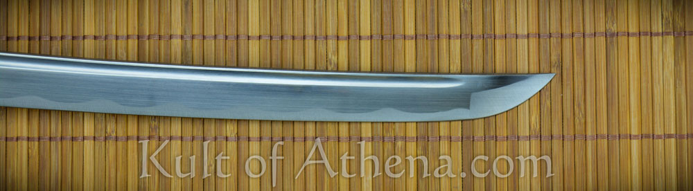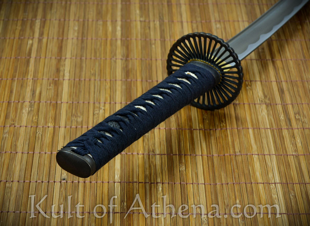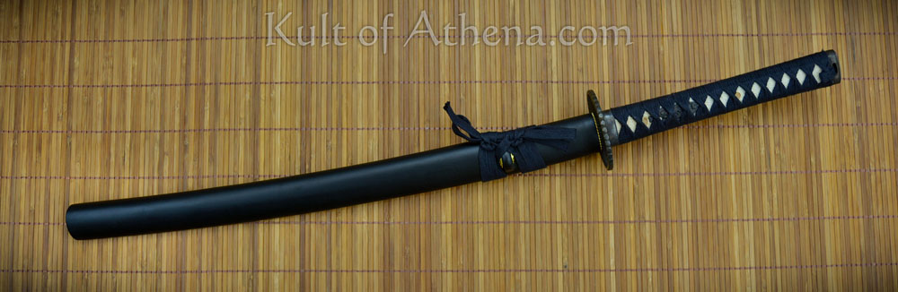 The wooden saya scabbard has a blackened finish and a black cotton sageo cord. Included is a cloth sword bag.