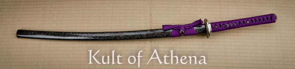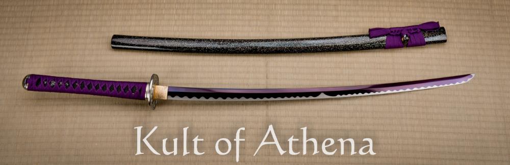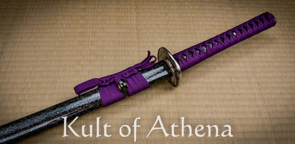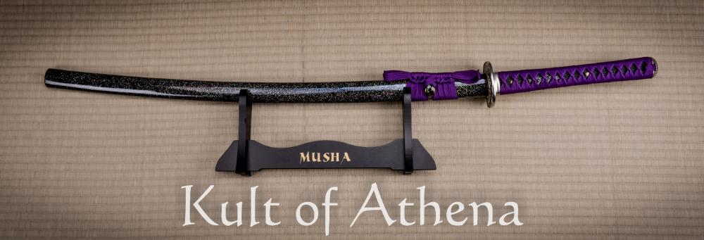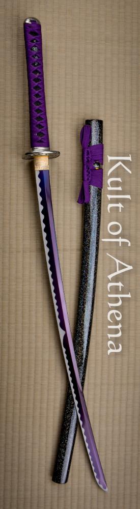 The sword is paired with a wooden saya scabbard which with a marvelously flecked and iridescent finish of glossy lacquer and a matching knotted sageo cord. Included is a display stand and a cloth sword bag for transport and storage.