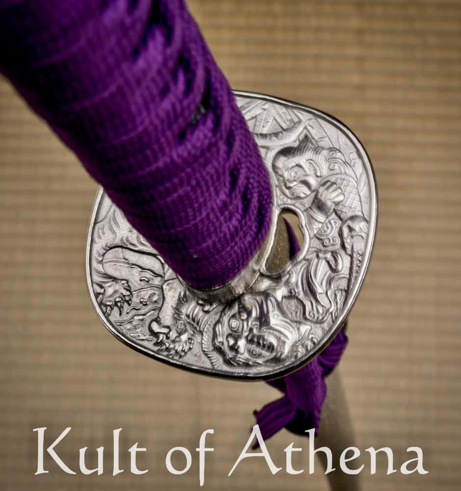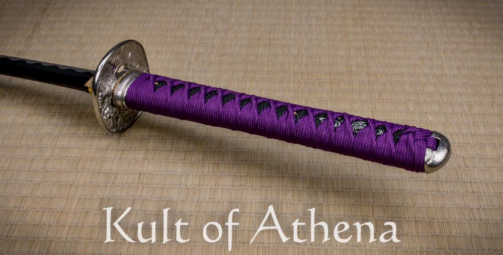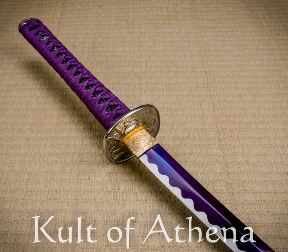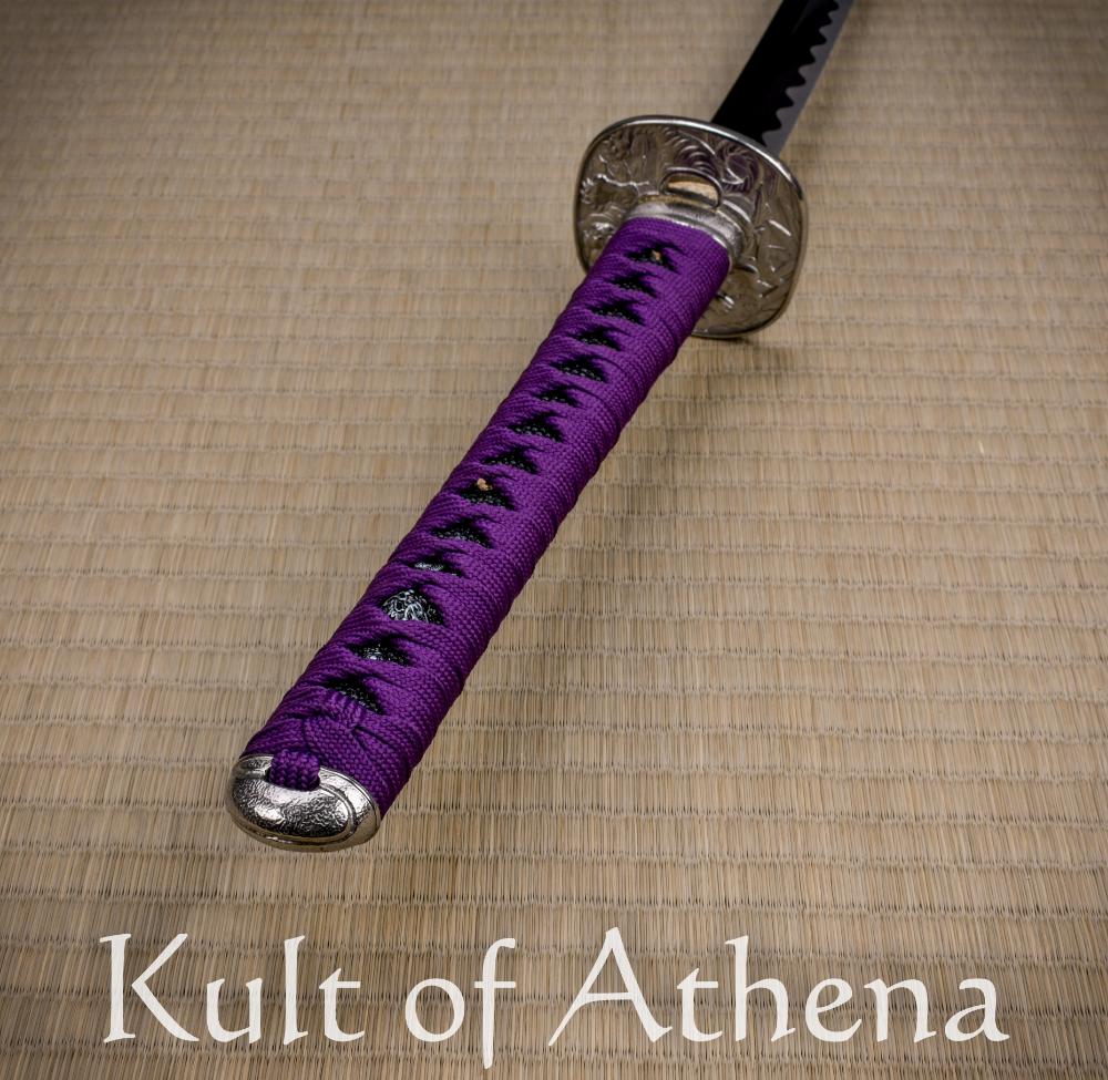 From the Musha Elite Collection, the “Chokkan” (Instinct) Katana has the upgraded blade of 1060 high carbon steel with a distinctive indigo-hue blued finish; it is well-tempered and ready to cut right from the box. The blade is solidly mounted into a hilt with a metal tsuba, fuchi and kashira that are beautifully silver finished. The tsuba features in lavish detail a warrior and a tiger with the warrior representing strength, discipline and strategic thinking and the tiger being a manifestation of agility, keen senses and raw power – the pair in totality representing the virtues of the perfected warrior. The wooden grip has panels of faux rayskin which are bound in knotted purple ito cord.