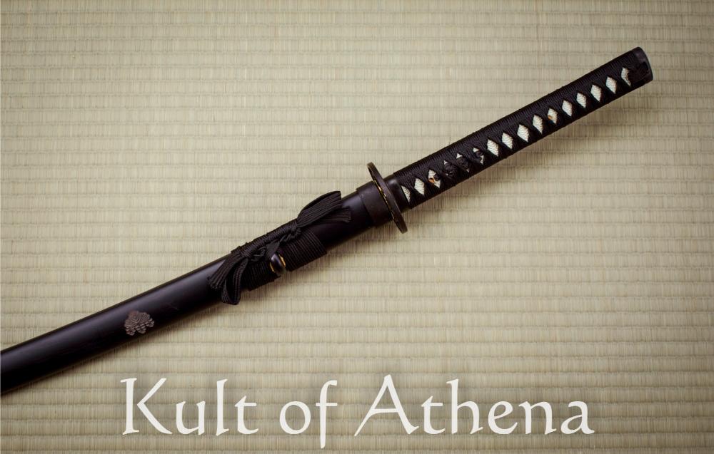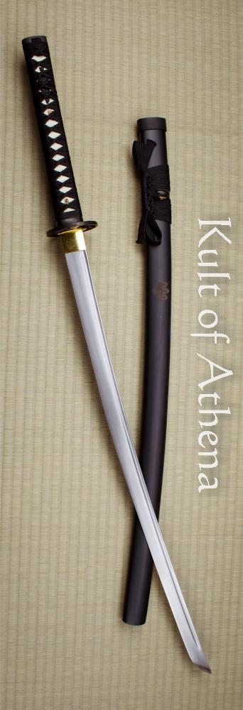 Gakuto commonly means educated person a reference, perhaps to the contemplative branches and golden leaves of the tsuba of this katana. The sharpened blade of this katana is made from carbon steel, and it is double peg-mounted into the tsuka handle giving its owner the option to remove the tsuka. The tsuba is zinc alloy with a charcoal patina finish. Beneath the black cotton tsuka-ito wrapping are two wise dragon menuki over faux rayskin. The saya is finished in matte black with an etched leaf design on one side. It comes with a black cotton sageo. The sword and saya come within a black cloth sword bag.