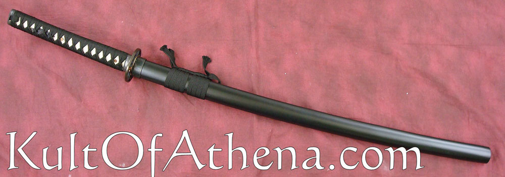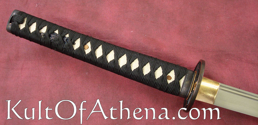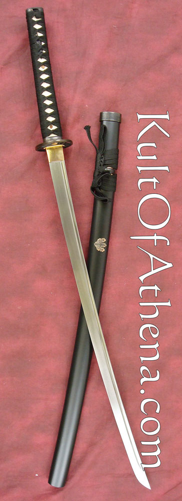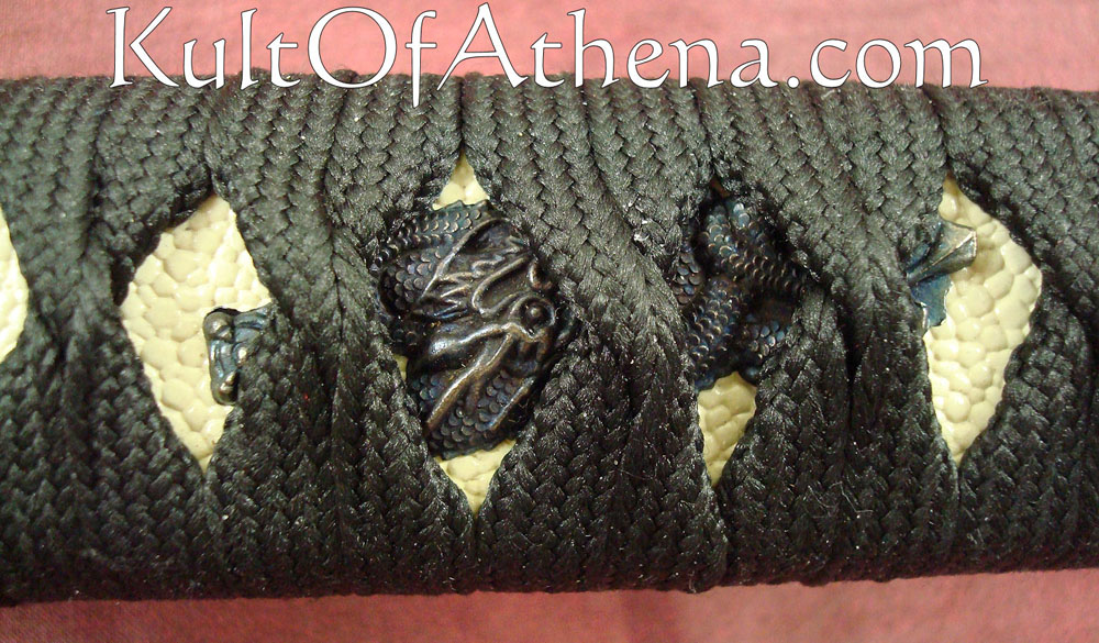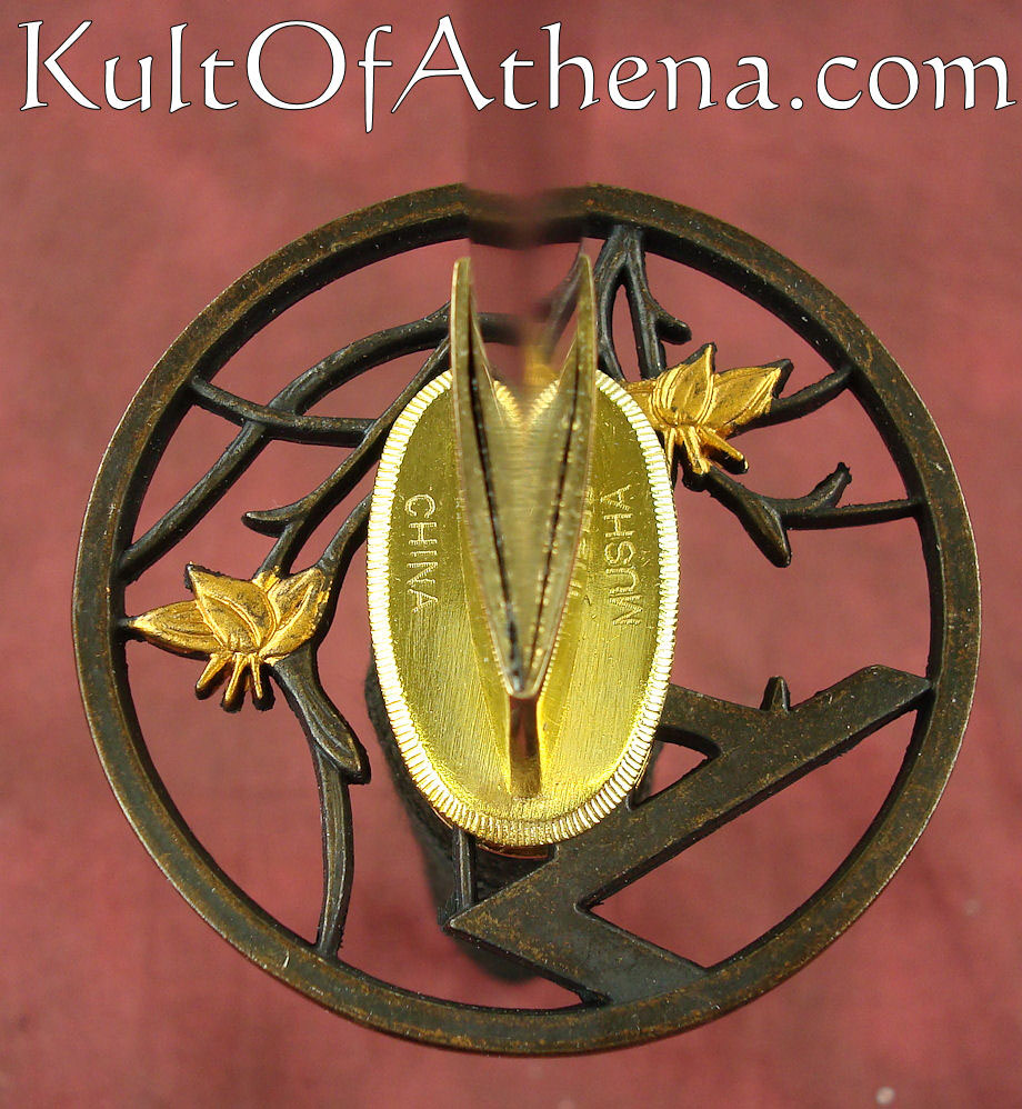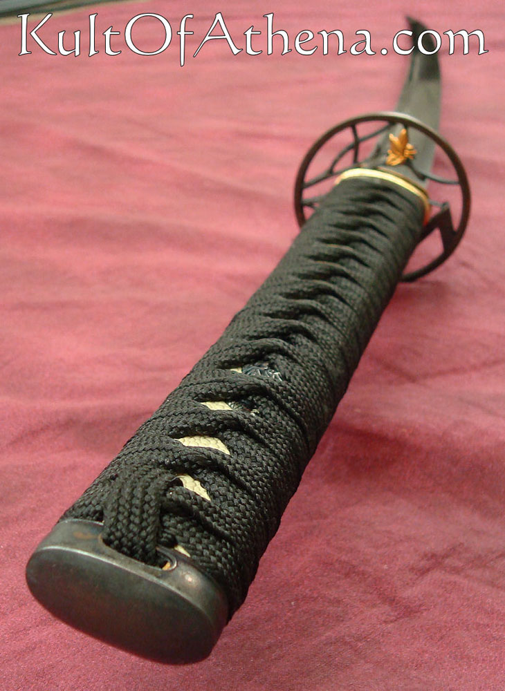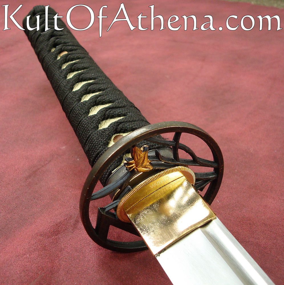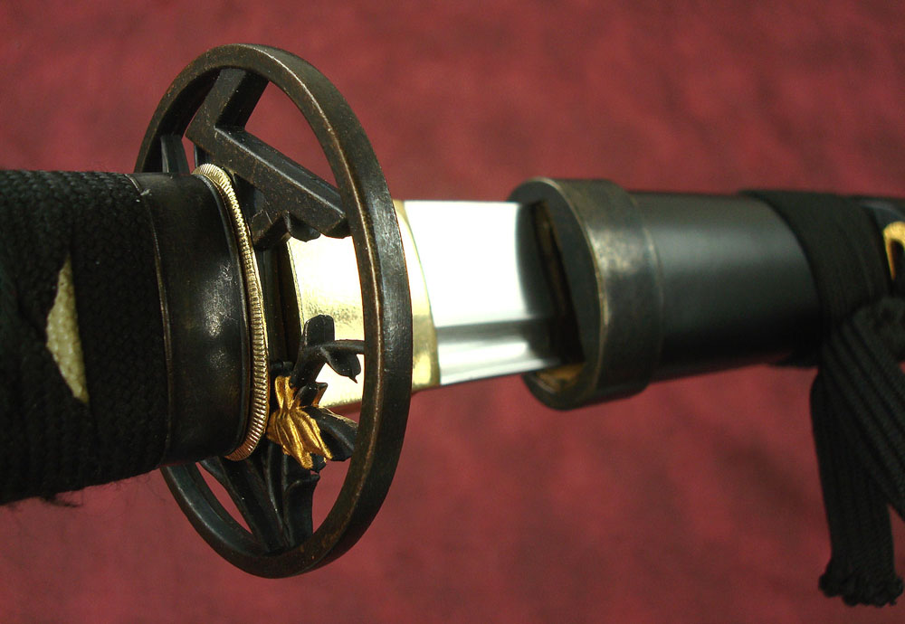 Gakuto commonly means educated person a reference, perhaps to the contemplative branches and golden leaves of the tsuba of this katana. The sharpened blade of this katana is made from carbon steel, and it is double peg-mounted into the tsuka handle giving its owner the option to remove the tsuka. The tsuba is zinc alloy with a charcoal patina finish. Beneath the black cotton tsuka-ito wrapping are two wise dragon menuki over faux rayskin. The saya is finished in matte black with an etched leaf design on one side. It comes with a black cotton sageo. The sword and saya come within a black cloth sword bag.