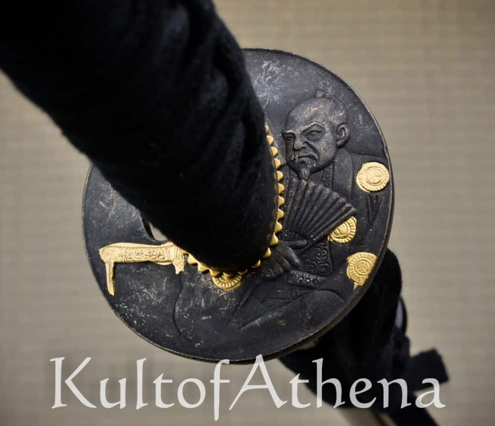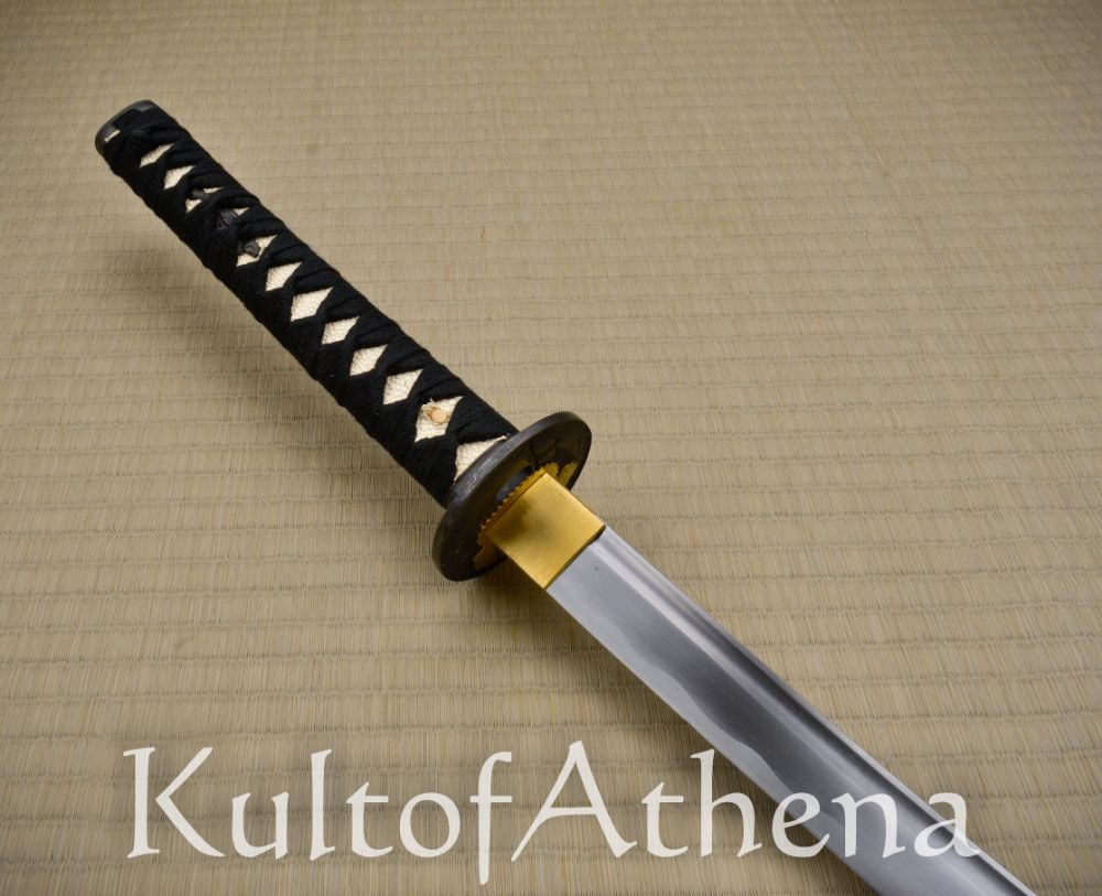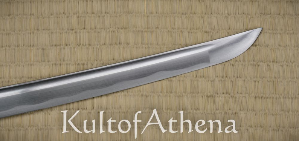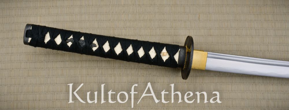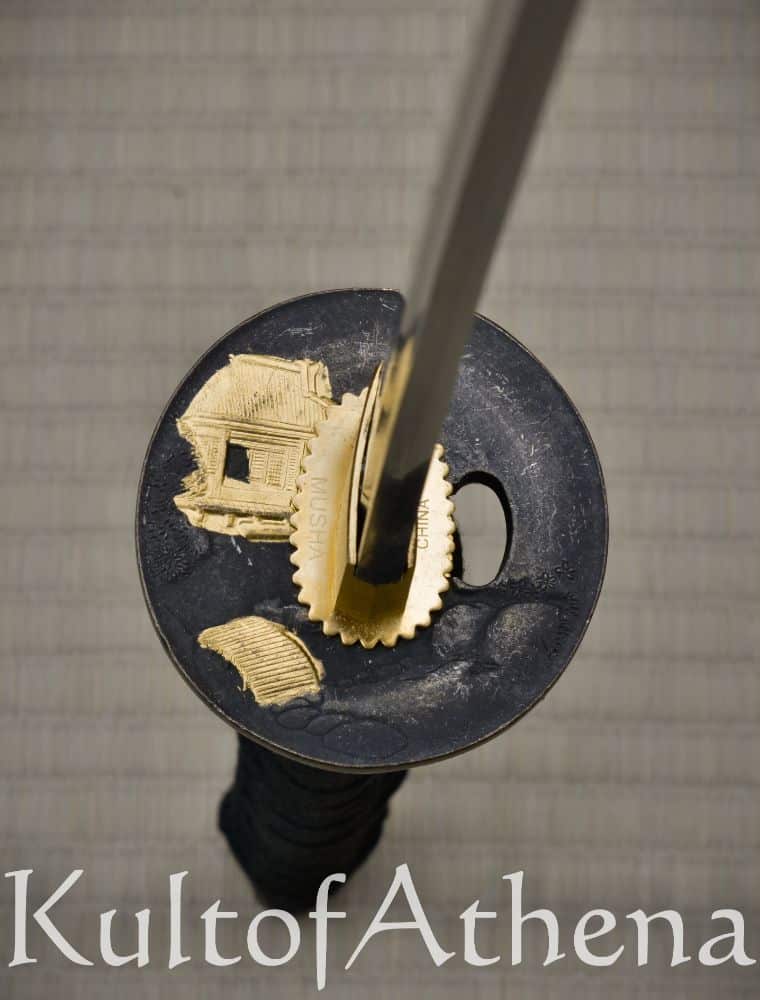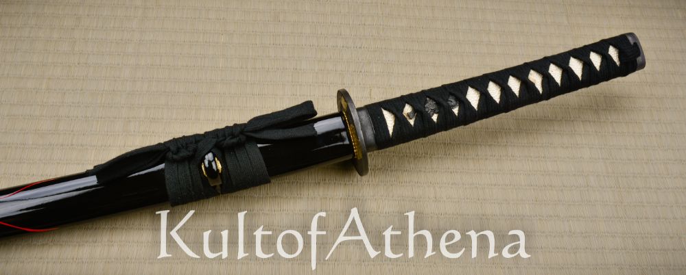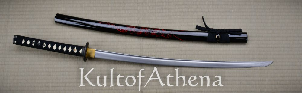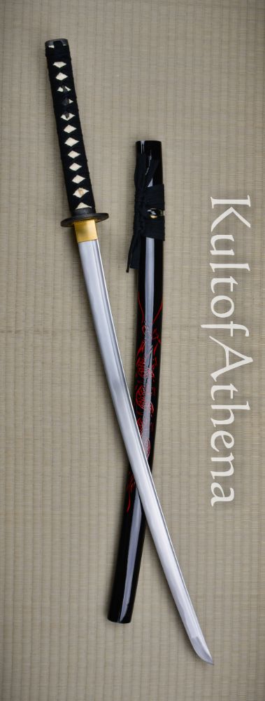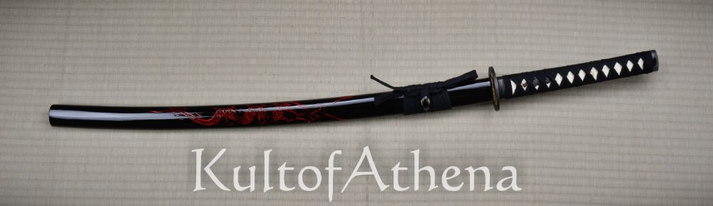 The Musha Kuzuryu Katana has a functional cutting blade of sharp 1045 high carbon steel; its bo-hi groove along the spine removes unneeded weight to optimize the sword for responsive, fast strikes. The habaki and seppa are crafted from brass and the tsuba, fuchi and kashira are of antiqued metal. The grip is crafted from wood and have panels of faux rayskin which are overlaid in knotted ito cord. Included is a black-lacquered wooden saya scabbard with a vibrant red dragon etched into the wood which is picked out in fine red lacquer. A saya cord completes the scabbard and a separate cloth sword bag is included for storage / transport.