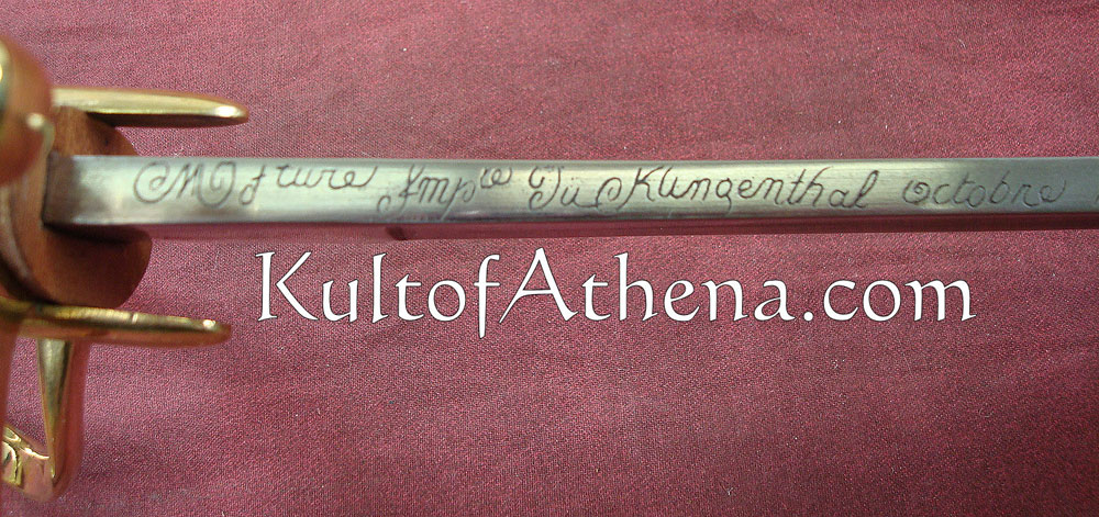 This replica saber of the AN XI has an unsharpened blade of tempered high carbon steel. The spine of the blade bears the recreated 1813 signature of the famed Klingenthal sword manufactory in Alsace. The hilt is of brass and the grip is wrapped in tight black leather. The scabbard is of steel with two integrated steel hanging rings.