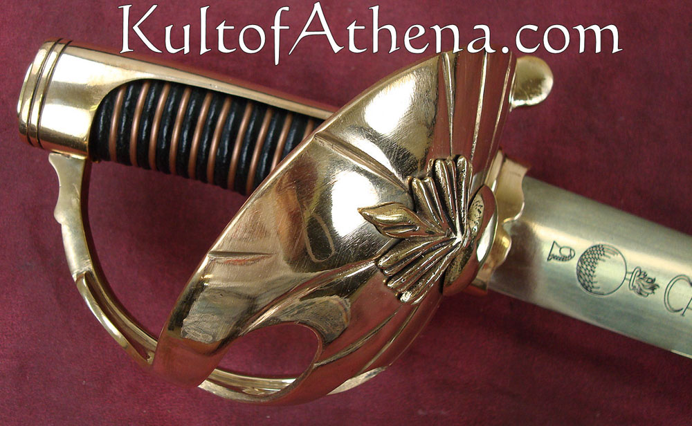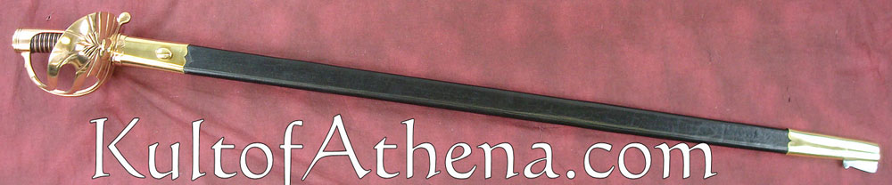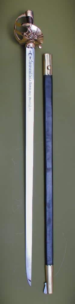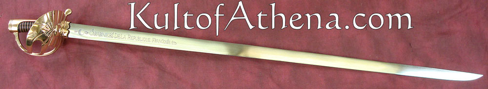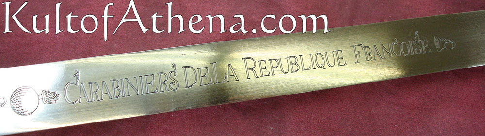 This Carabinier straight saber has a blade of unsharpened, tempered high carbon steel. It is engraved with Carabiniers Dela Republique Francoise on both sides. The hilt is of bronze and the grip is of hardened black leather with inlaid bronze wire. The grip has an integrated leather loop. The scabbard is of black leather with brass accents.