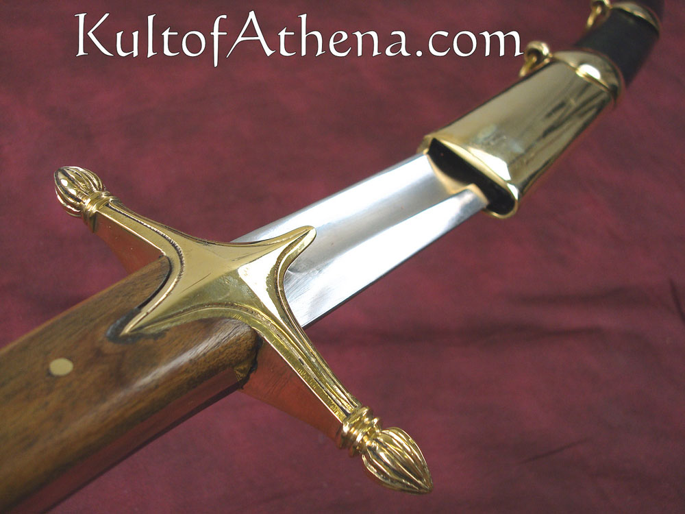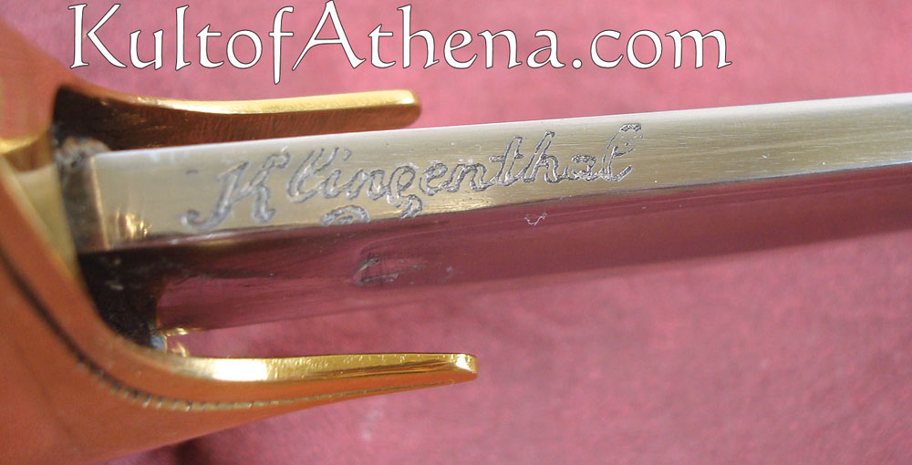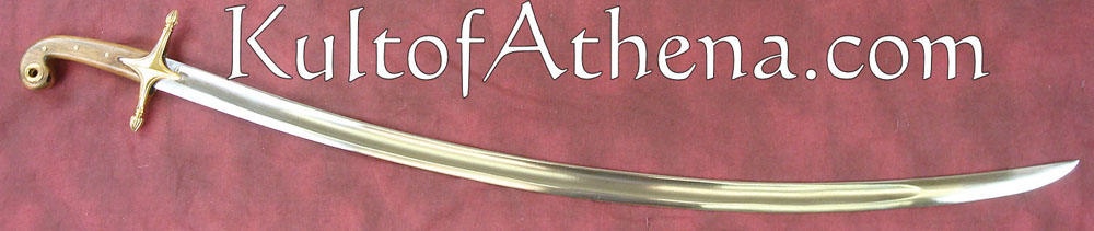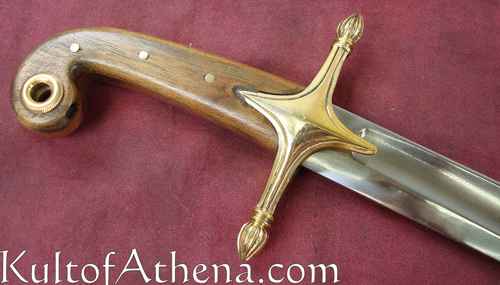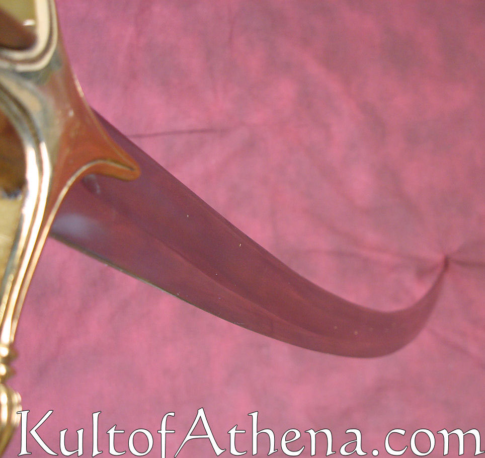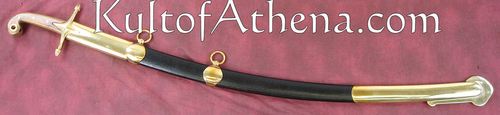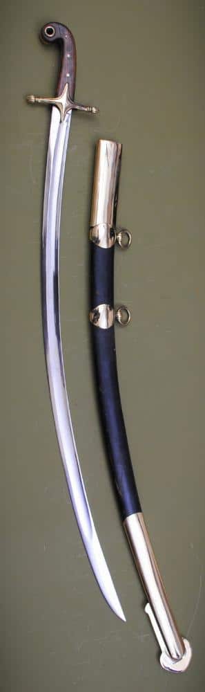 This Napoleonic Mameluke sword has an unsharpened blade of tempered high carbon steel. The spine is etched with the signature of Klingenthal, the state-run sword manufactory of Napoleonic France – they would have manufactured these Mameluke saber blades to specially outfit Napoleons most colorfully exotic troops. Many French Officer’s also carried Mameluke sabers, as all things Egyptian were in vogue after Napoleon’s Egyptian adventure. The guard is made of brass and the grip is of wood sandwiched between the tang and brass mid-section. Brass pins hold the tang in place. The wood-core scabbard is tightly covered in black leather with overlaid brass accents and brass hanging rings.