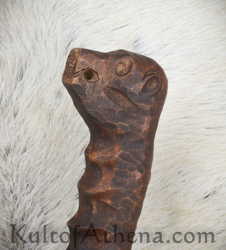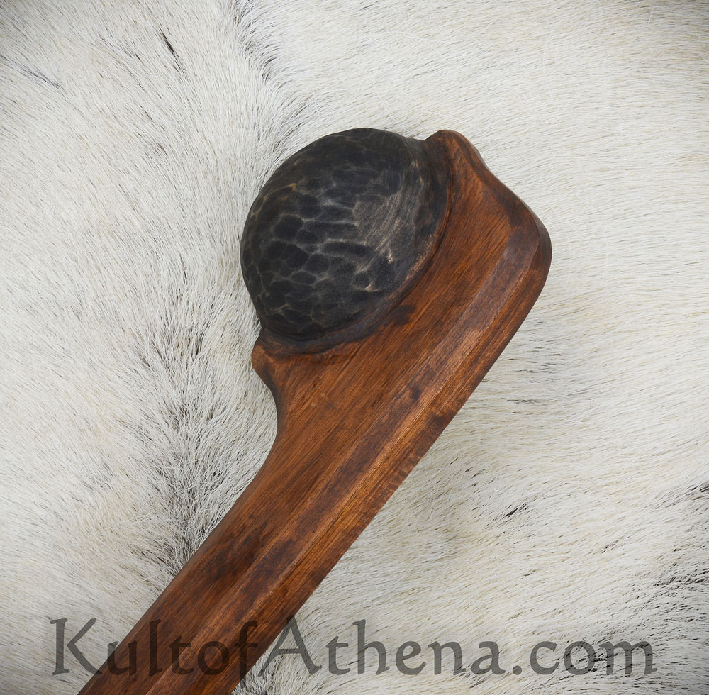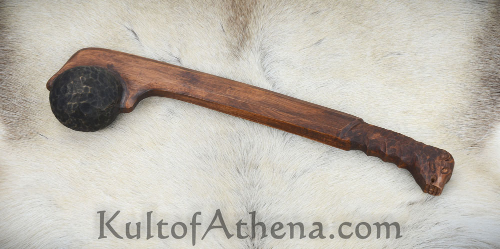 This Native American Ball Club is carved from hardwood and has a handle which is hand-carved into a bear head. A common weapon to the tribal warriors of the Eastern Woodlands and Great Lakes, these clubs were light and very quick and a stylistic match to the agile and unhindered fighting styles of the warriors who used them. Though light and fast, a well-placed blow from such a club could smash the skull or bones of a foe.