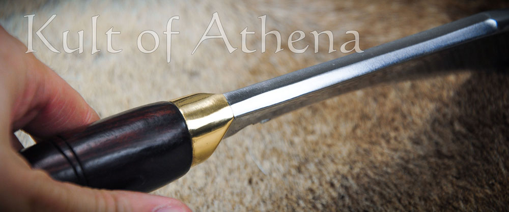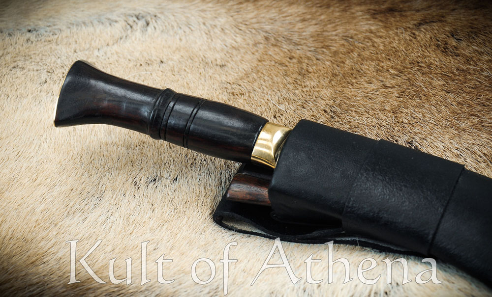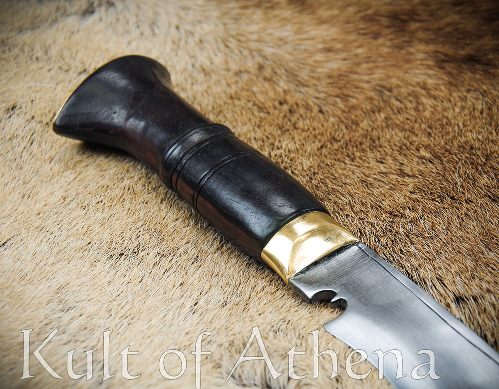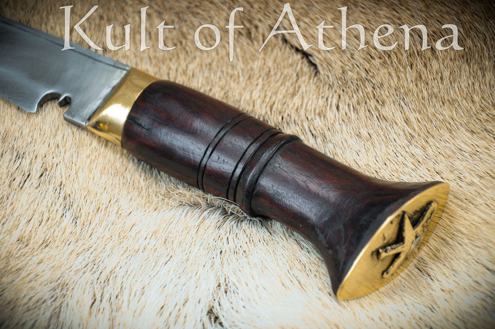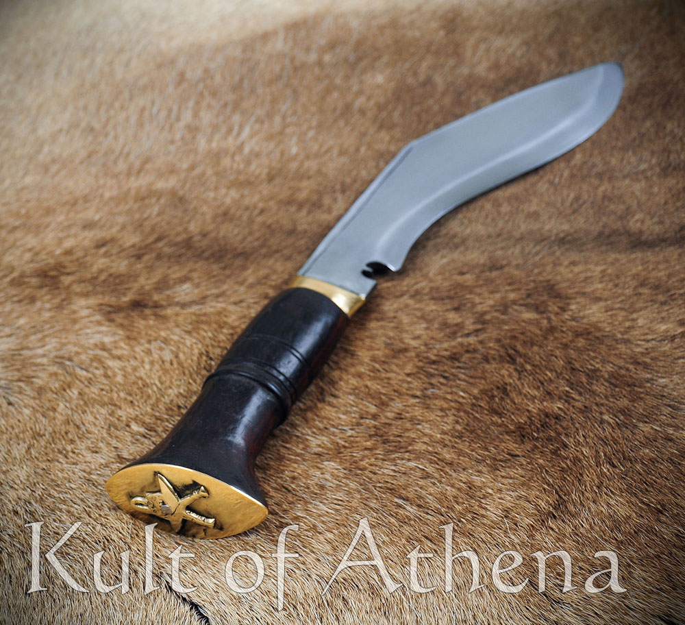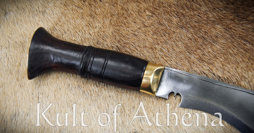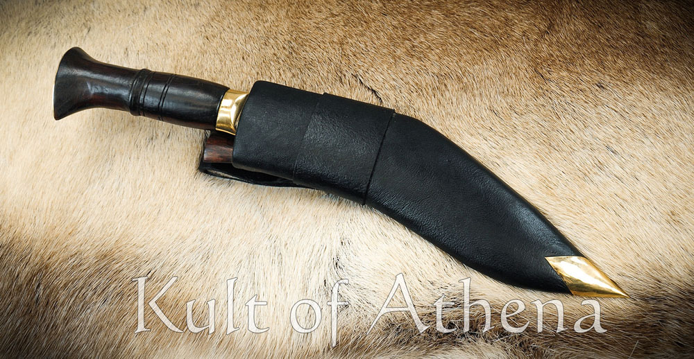 The hilt fittings are of brass and the grip is of carved rosewood. The companion scabbard is made in the traditional fashion with two carved halves of pinewood and Laha tree gum glue. It is finished with an outer layer of black leather, a brass tip and a belt loop. It comes with a pair of traditional tools and a space for them in the scabbard. These are a Karda utility knife and a sharpening tool, the thicker Chakmak. The two knives match the larger Khukuri by having blades of high carbon steel and carved rosewood grips.