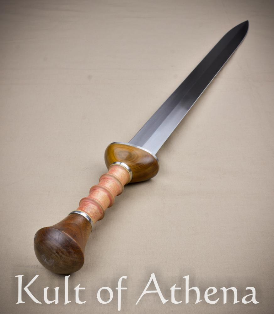 The Legacy Arms classic Imperial Roman Gladius mimics an original found in the ruins of Pompeii (reliably dating from 79 CE).  Features a sharpened and tempered double edged high carbon blade,  hardwood handle & high polished steel spacer at the bottom of the handle for strength and durability.  Sword also includes a wood scabbard wrapped in black leather with steel accents at throat and tip to complete the sword.