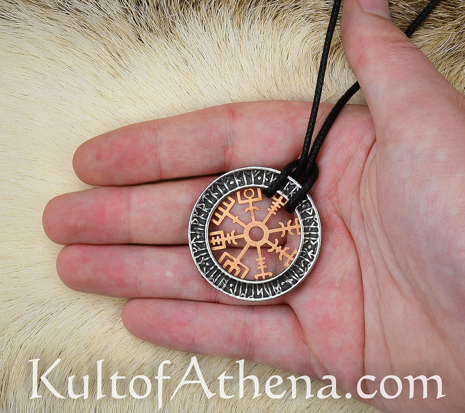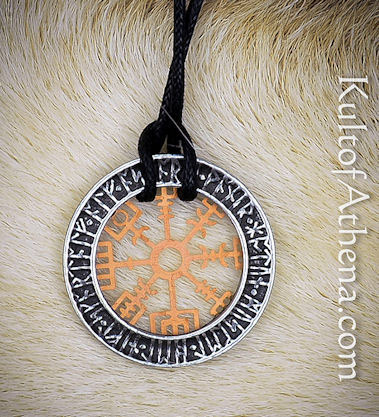 Vegvir; the Wayfinder stave rune. This Icelandic magical stave aids its bearer in finding path and safe harbor through the turbulent storms of both the briny deeps and the tempests of life itself. This pendant bears this Viking Vegvisir sigil rendered in earthy bronze and is encircled in a runic circle of lead free pewter. Included is an adjustable cord for wear.
