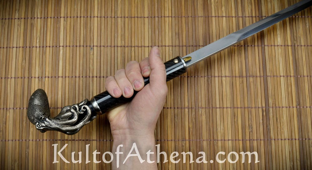 Intelligent and cunning, the Octopus is a master of disguise and can hide in plain sight; both decisive on the strike and fierce on the defense, the Octopus is quite a fitting inspiration for this sword cane. This tough and eminently functional sword cane has a shaft of glossy carbon fiber with a hard rubber tip for walking support. The Octopus which forms the bold handle-piece of this sword cane is supremely detailed and crafted from antiqued cupronickel and has a solid heft to it.