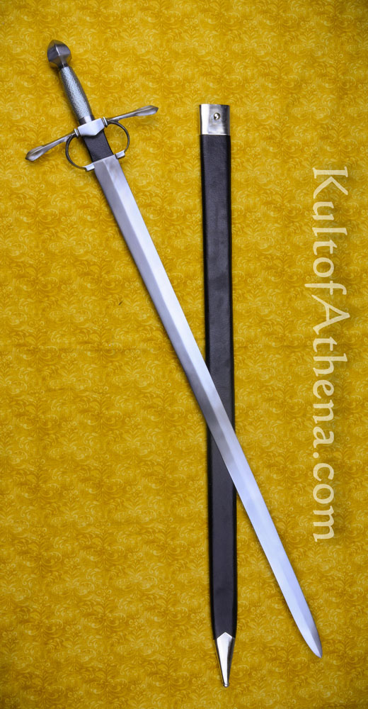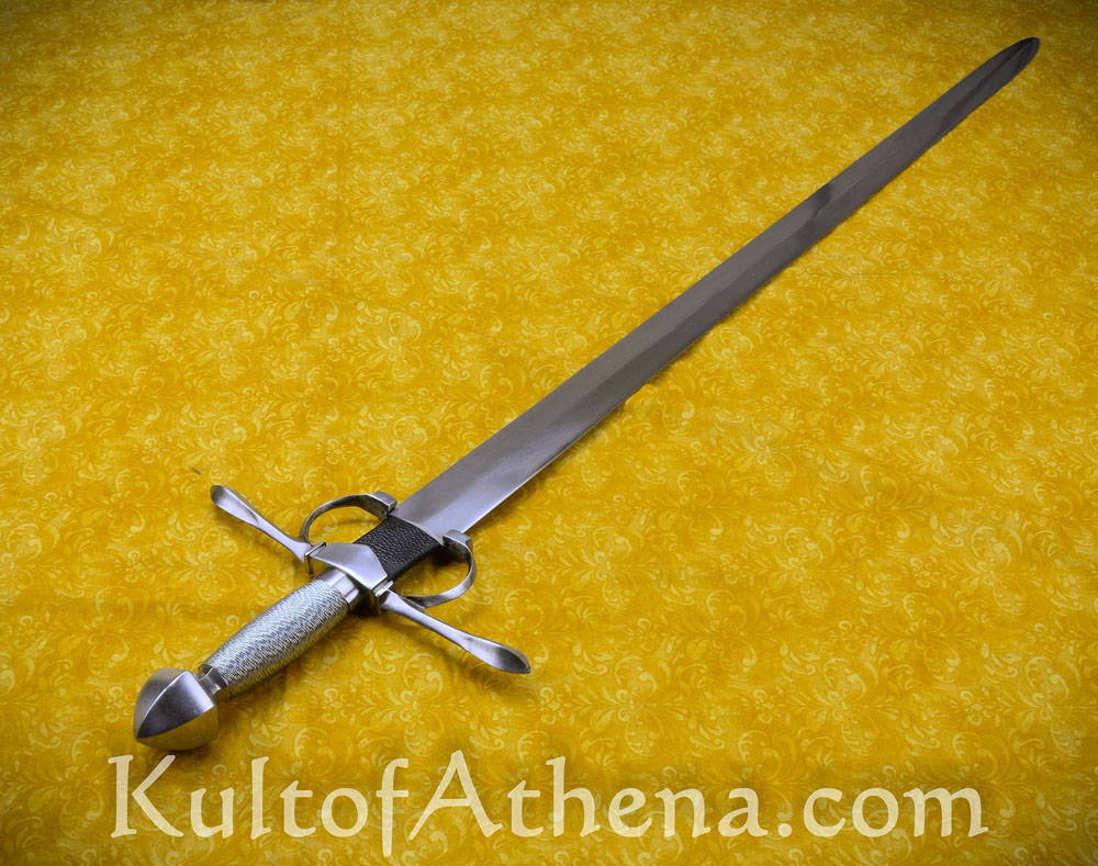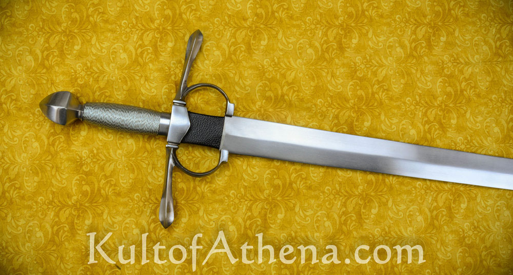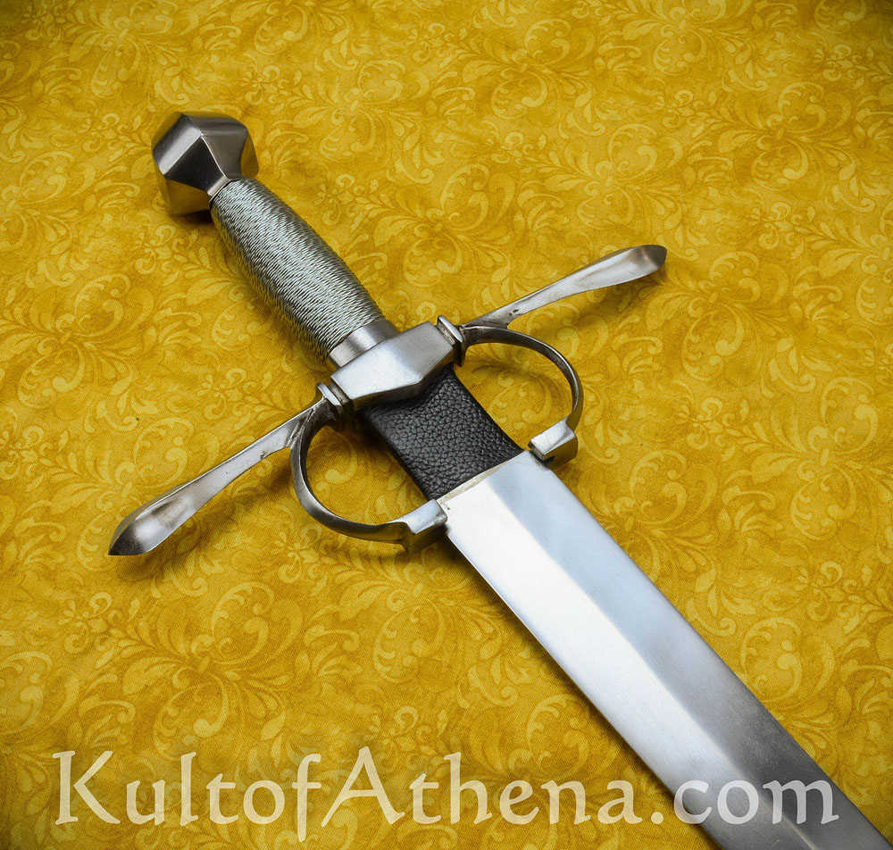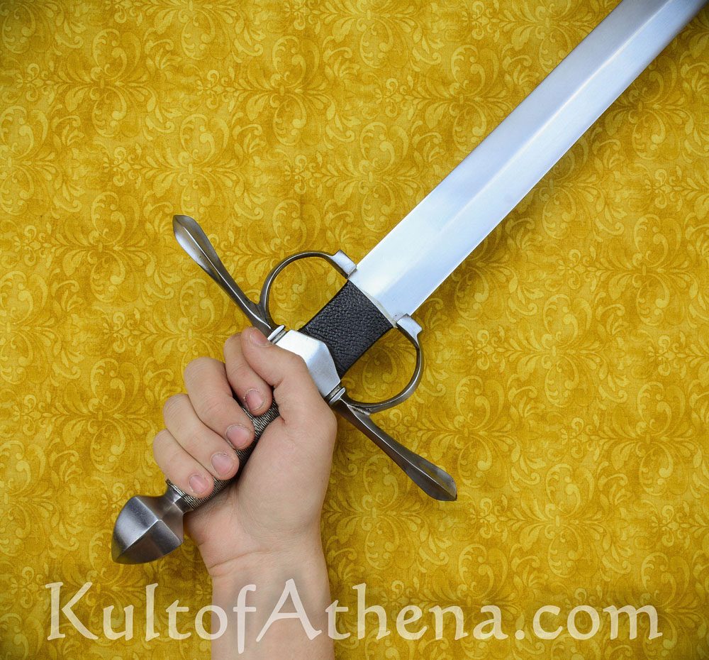 Better Than Expected There aren’t that many swords offered that represent the “cut and thrust” blades of the 15th and 16th centuries at this price point. I was pleasantly surprised to find this sword offered and I am suitably impressed with the apparent quality for the money. First, the good: the blade is light and responsive, has a good reach for a single-hand sword, and isn’t too whippy despite lacking a fuller to stiffen it. The handle may look short initially but this is really a design feature as the first finger is meant to slip over the quillon through the side rings to grip the ricasso. This gives very nice point control for the thrust. I was worried from the picture that the shape of the quillon block would cause it to dig into my forefinger but even after handling it barehanded this doesn’t seem to be as much of a problem as I anticipated. The quillon block itself is about half an inch wide at the point your finger loops over it, and the squared off contours give a parallel surface for your fingertip to “grip” on the other side. The fit of the parts also seems to be solid and there is no appreciable loosening, rattling, or pinging noises after vigorous shaking. I haven’t tested it in any more destructive manner. Lastly, as can be appreciated from the pictures, the sword is almost wholly symmetrical, with only a few very minor decorative elements on the side rings not being repeated from right to left, so there is good news for left-handers. Now, for the bad, which is mostly cosmetic and may be individual to the sword I received: the finish of some of the hilt hardware is uneven, with the seating of the handle within the quillon block being uneven (the slot the tang passes through seems somewhat oversized and is just visible beyond the edge of the grip on one side), the quillon block itself being uneven in shape with one side somewhat larger than the other, and the side rings noticeably asymmetrical (both seem slightly bent down at a slightly different angle towards the grip). The side rings actually come into contact with the blade at the top of the ricasso and, upon vigorous shaking, there are some unpleasant, high pitched metal on metal grinding noises. I believe that with many historical examples, the “fork” at the top of the side ring does not actually come into contact with the blade for just this reason. I passed a few pieces of paper between the gap to attempt to clear it of debris (the gap is too small to admit anything thicker) but there was no appreciable change in the noise. Lastly, there is a small inconsistency in the turning of the wire around the handle, amounting to a tiny burr that cannot even be felt when gripped bare handed but is somewhat noticeable and might perhaps get worse over time. All in all, I would say it is definitely a good sword for the low price, better than I expected, and fulfills the very useful niche of a light, maneuverable cut and thrust sword designed for use with the forefinger extending the grip beyond the quillon. In contrast to other cut and thrust offerings, like the Windlass Munich sword, the grip is not encumbered with further bars and rings to protect the hand. This omission makes the Opera Nova sword very light, but it also practically necessitates the use of a buckler or shield in order to protect the hand and wrist, as mentioned in the product description.