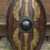 This foam Scutum Shield is heavily inspired by the shields used by many legionaries of the Roman Empire. It is robustly constructed from durable, firm EVA foam and encased within a painted shell of handpainted latex which has been skillfully applied to imitate the appearance of real wood, iron and bronze. The strong central grip bar on the reverse is sturdily integrated with the shield and is wrapped in leather.