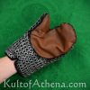 These chainmail mitten gauntlets is made from mail rings which are stitched onto a padded gambeson gauntlet to give its wearer protection from cuts and concussive impact alike. The mild steel rings are 17 gauge in thickness and have an internal diameter of 9mm. Half of the flat rings are riveted and these alternate with solid flat rings. The arming mitten itself is of thick, quilted cotton which is padded on the inside with organic cotton. The underside of the hands is lined with quality, supple leather for ease of movement and grip.