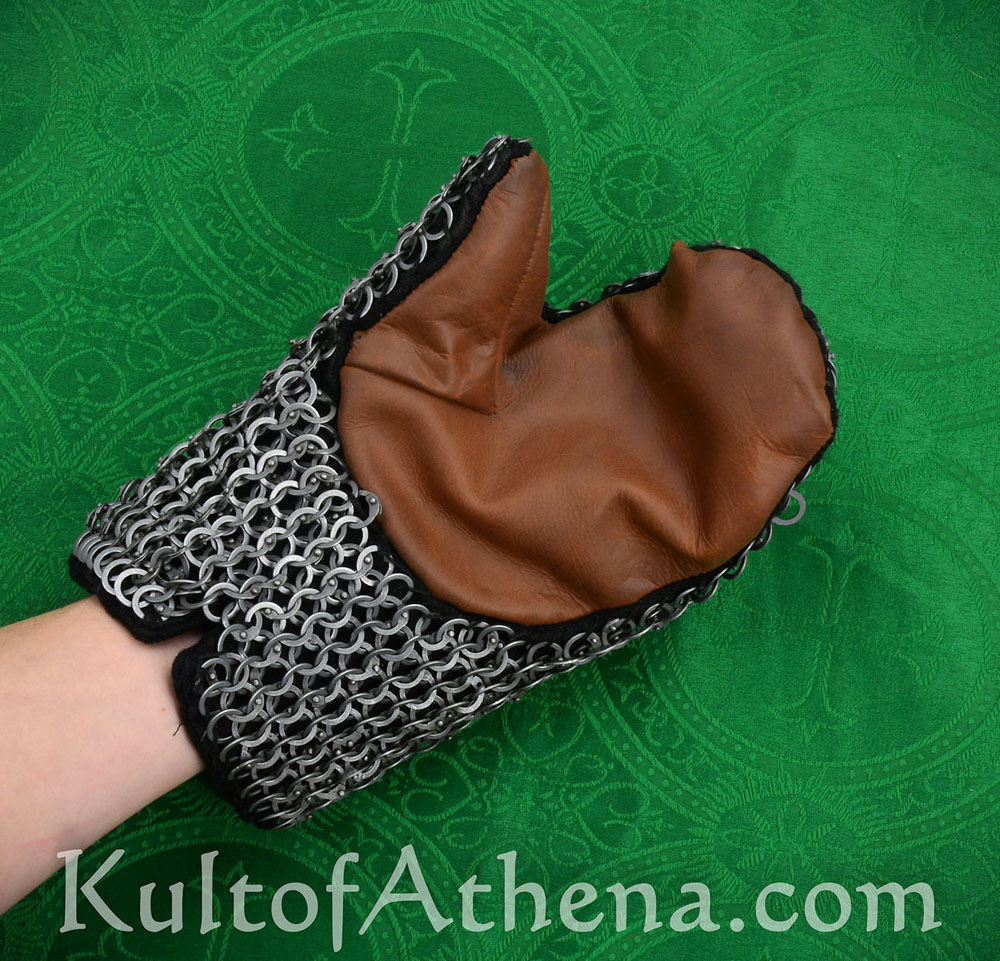 These chainmail mitten gauntlets is made from mail rings which are stitched onto a padded gambeson gauntlet to give its wearer protection from cuts and concussive impact alike. The mild steel rings are 17 gauge in thickness and have an internal diameter of 9mm. Half of the flat rings are riveted and these alternate with solid flat rings. The arming mitten itself is of thick, quilted cotton which is padded on the inside with organic cotton. The underside of the hands is lined with quality, supple leather for ease of movement and grip.