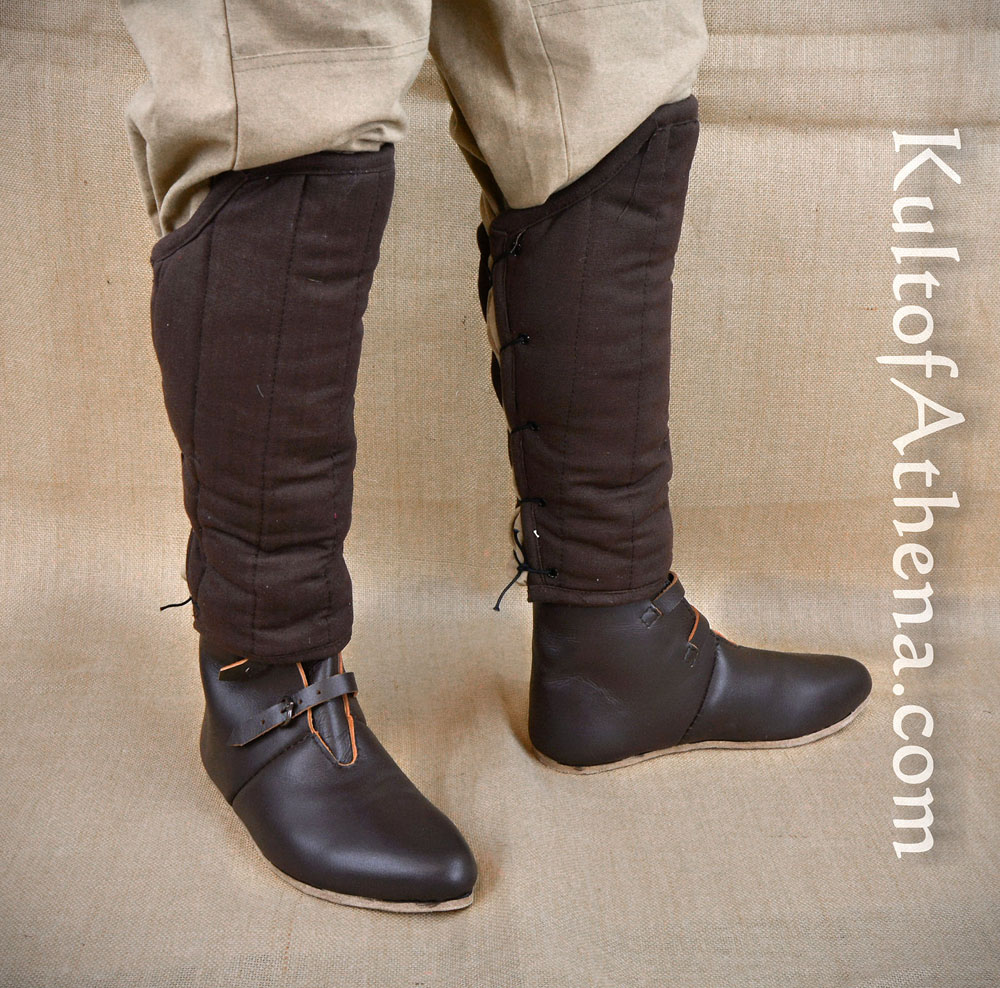 These padded greaves on their own add notable protection from cuts and slashes to the lower legs and can be used on their own or as a base layer of padding behind chainmail chausses or steel plate greaves.