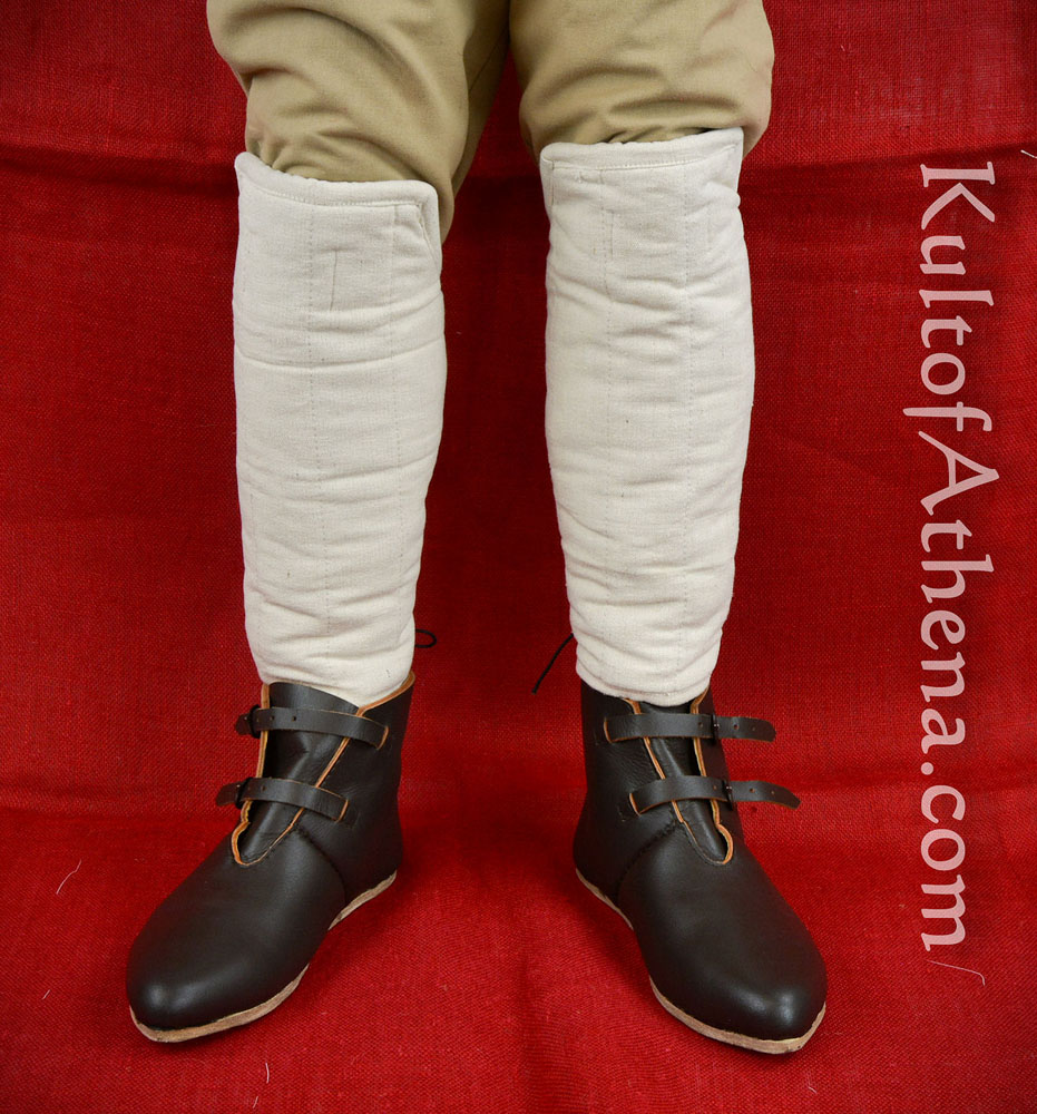 These padded greaves on their own add notable protection from cuts and slashes to the lower legs and can be used on their own or as a base layer of padding behind chainmail chausses or steel plate greaves.