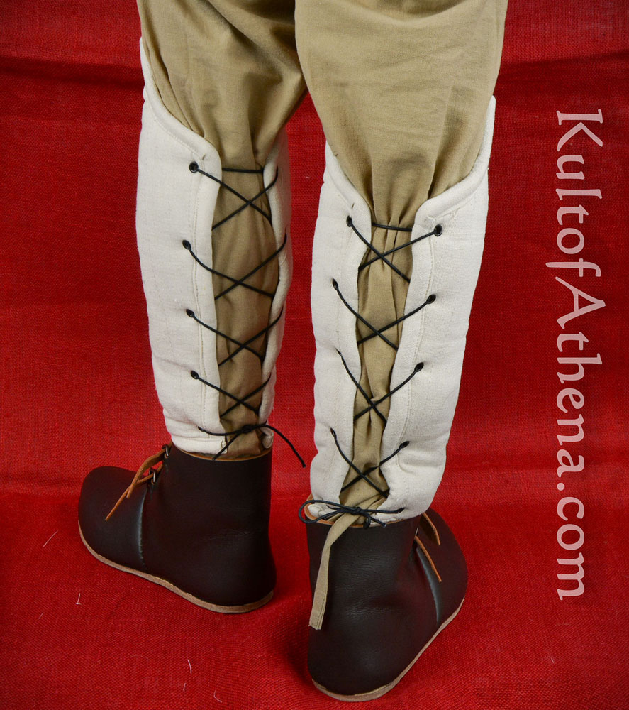 These padded greaves add an essential base layer of base protection to the shins and ankles of your armored defense; they are constructed from a thick and durable 85% cotton material and padded on the inside with similar cotton. Leather lacings coupled with metal grommets allow these padded greaves to be simply laced onto the lower legs.
