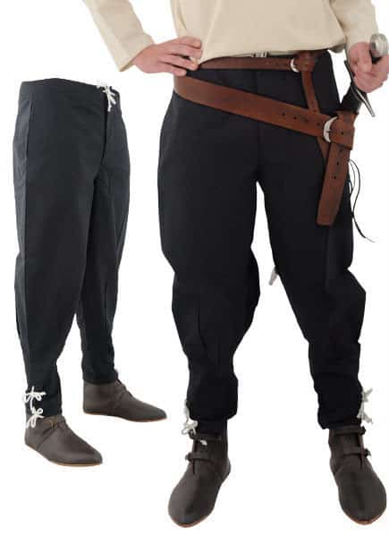 These 100% cotton pants are full-cut with a sharp taper at the ankle. Featuring a drawstring waist, button fly and cord ankle-ties, these pants are a match for many period costumes.