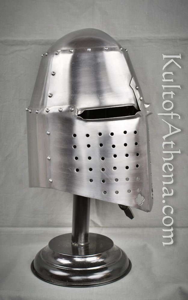 This 14th Century Great Helm is based on the helm of Sir Richard Pembridge, an English knight who served King Edward III during the Hundred Years War. The helmet is a great example of the type of Great Helm worn by knights and professional men-at-arms at battles such as Crecy (1346) and Poitiers (1356). These domed-top Great Helms were a notable improvement over flat-topped helms by better deflecting and redirecting the force of a downward blow. The raised ridged at the eye slits give them greater durability to prevent easy deformation and the large quatrefoil cut-outs serve as an anchor point for a chain-toggle that would have been connected to the breastplate. This chain connection allowed for knight the remove the helmet and free his hands for other weapons or his mount’s reins as needed without fearing for the loss of his helmet. (No chain toggle is included).