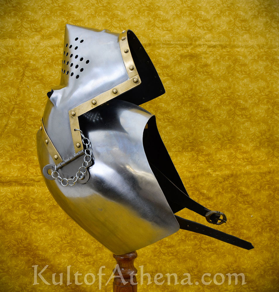 This Pig Faced Bascinet Helm is crafted from 18 gauge steel with a riveted brass faceplate trim. The visor can not only be raised upwards, but removing the side pins from the hinges allows the visor to be removed entirely.
