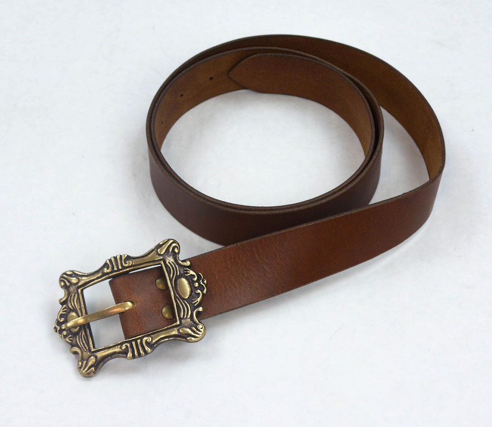 This Pirate Captains Belt is crafted from supple, thick leather; it is fitted with a large, antiqued brass buckle.