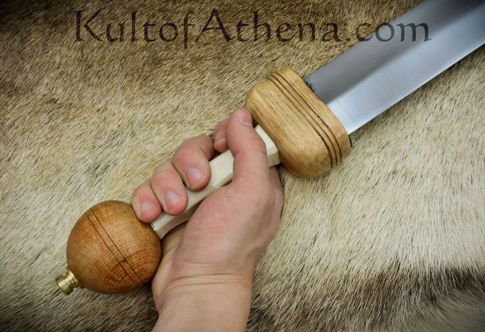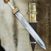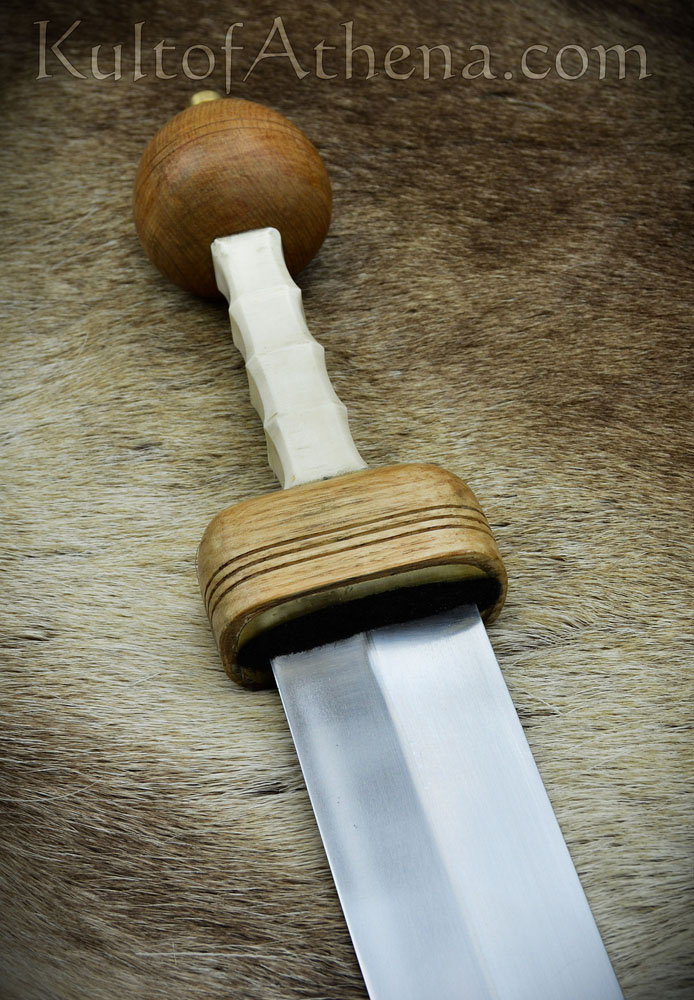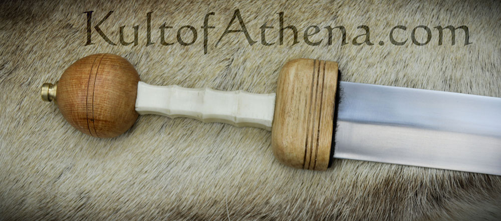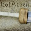 This Roman Pompeii Gladius has a blade forged from high carbon steel; the pommel and guard are crafted from wood and the grip is of carved bone. The sword tang is secured against the pommel with a brass pommel nut and the guard is protected with a brass guard-plate which is inlaid into the wood of the guard. On top of this is a felt tab which cushions the hilt from contact with the scabbard – it can be easily removed if desired.