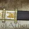The scabbard is crafted to to have a body of wood which is overlaid in leather and bound in extensive brass and steel fittings and brass hanging rings – all of which are based on original finds of surviving scabbard fittings. The iconographic plates are fitted to a single side.