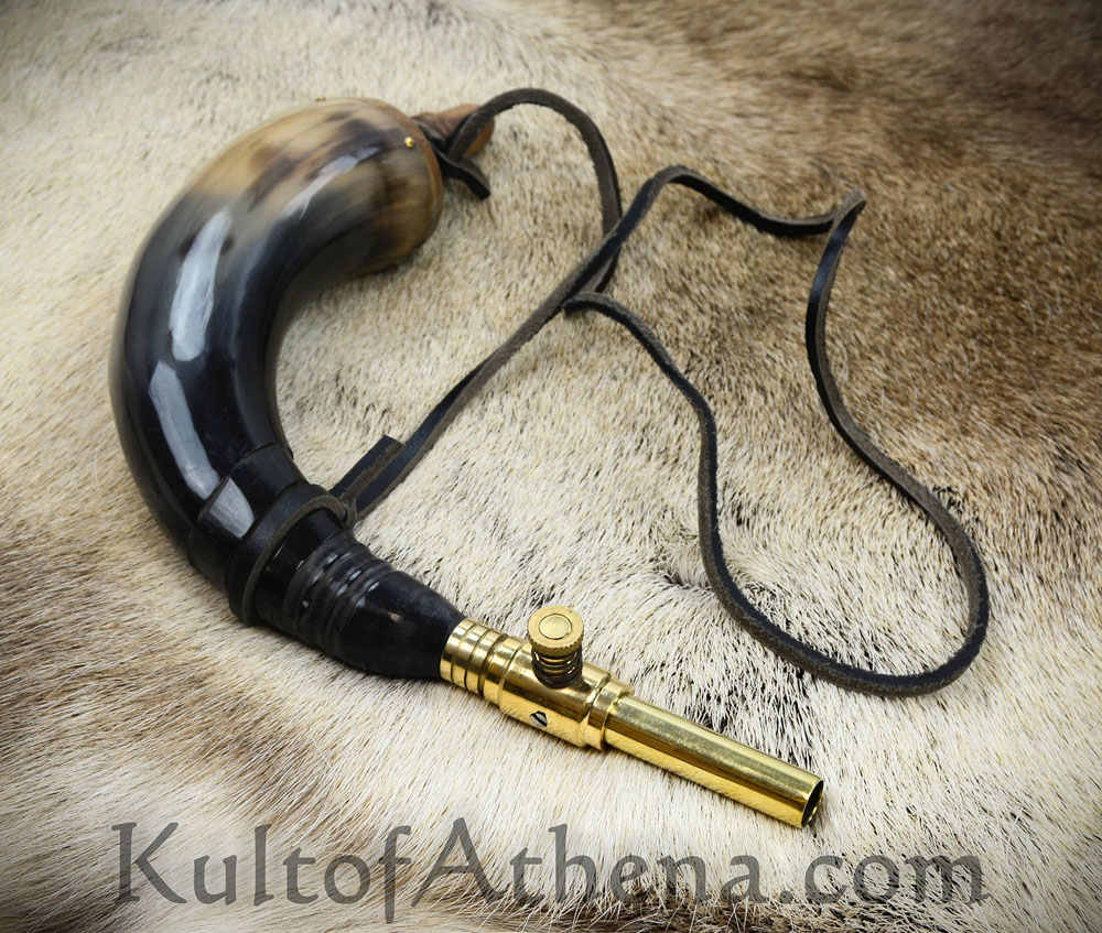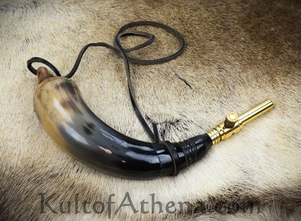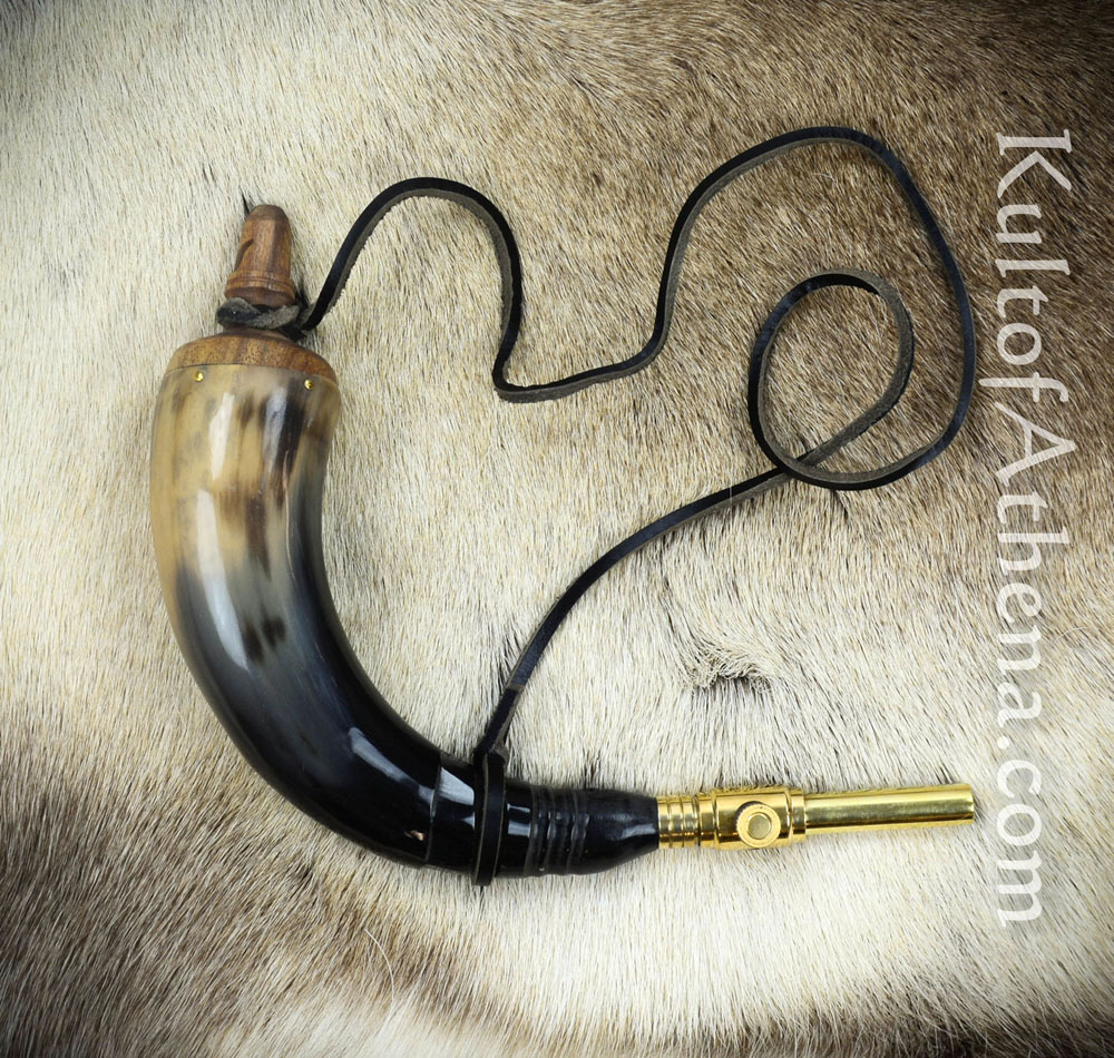 This Powder Horn is crafted from a buffalo horn that has been polished to a glossy sheen; It is capped with a carved wood plug that is secured with brass pins. The working valve is crafted from brass and has an integrated spring pin that is pressed to open the valve to pour gunpowder. It is finished with a fitted leather cord for wear.