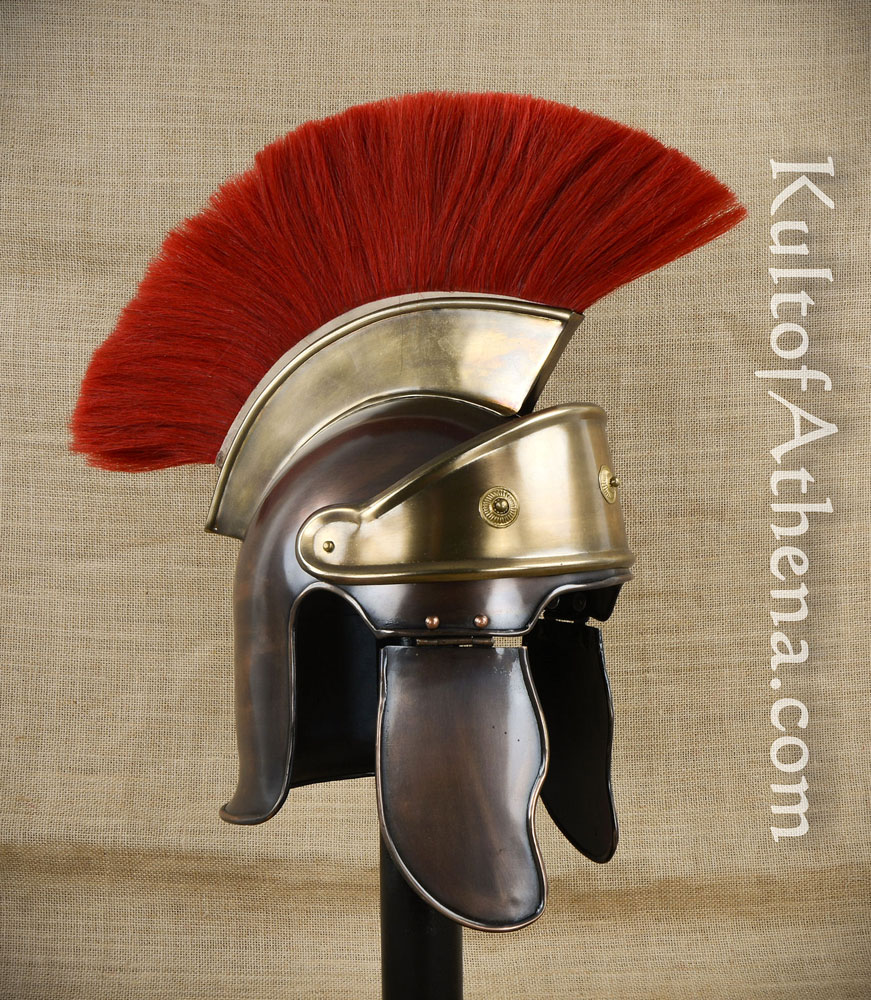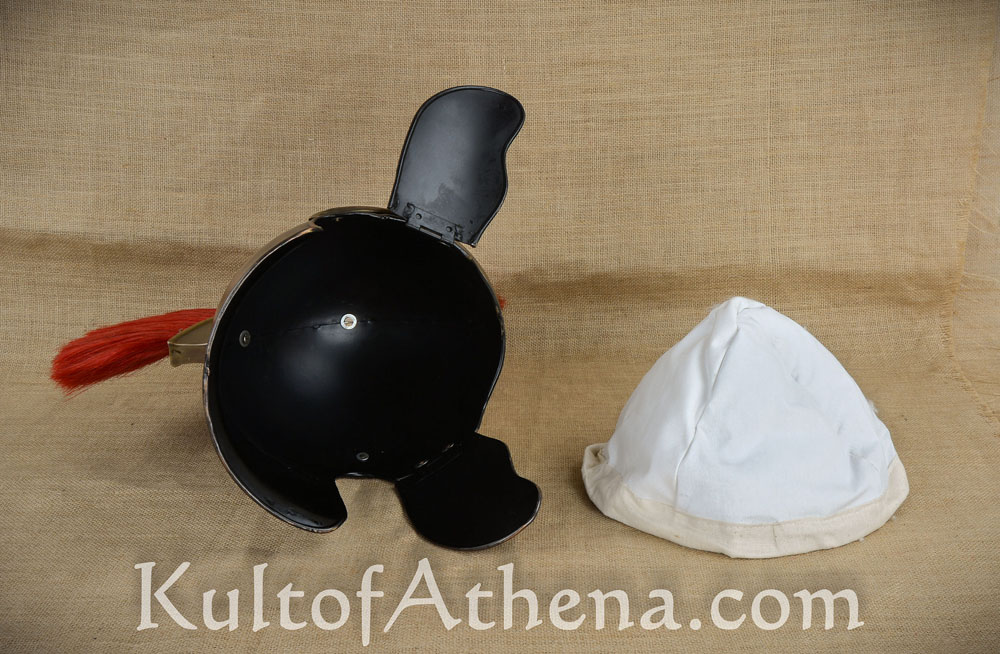 The Roman Praetorian Helm is crafted from 18 gauge steel which was finished with a contrasting antiqued bronze and brass finish. The cheekplates are hinged and the interior is both blackened and unlined. Included with the helmet is a separate padded cotton arming cap.