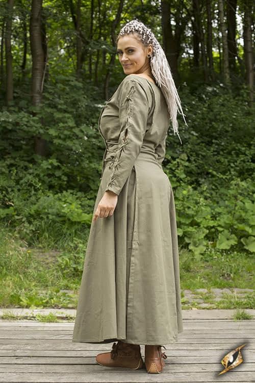 Epic Armourys Priestess Dress is a formal and elegant dress with long sleeves designed to function on its own or combined with other Epic Armoury clothes. Made from comfortable, soft cotton, this dress is tailored to be exceptionally versatile. The neckline is wide, showing off the collarbone and shoulders, complementing and balancing the rest of the dress design. Wear the long sleeves completely open in the summer, partially laced to show off your chemise, or tie them tight and straight from shoulder to wrist.