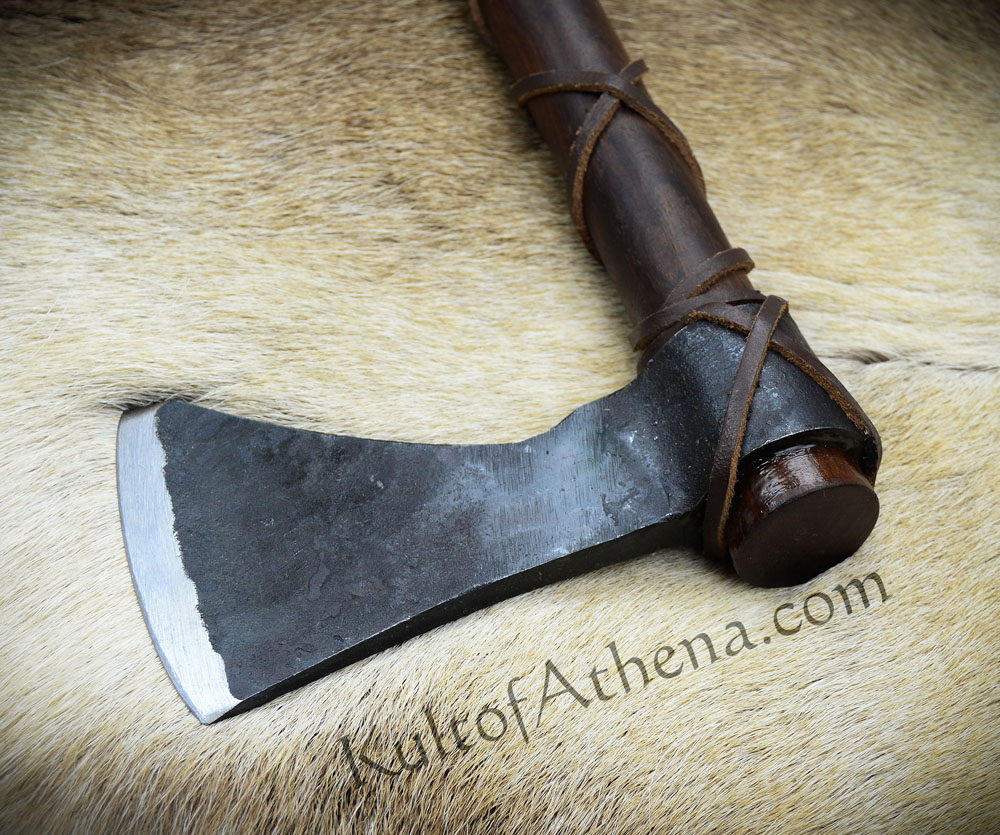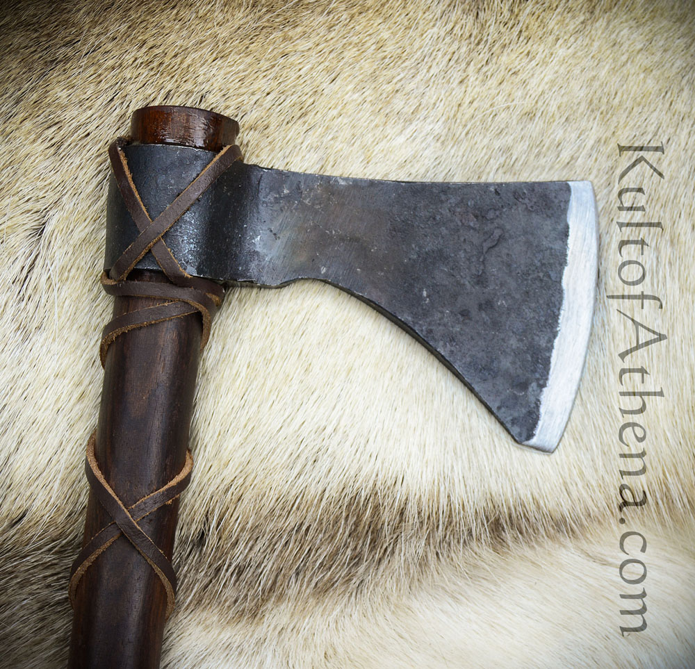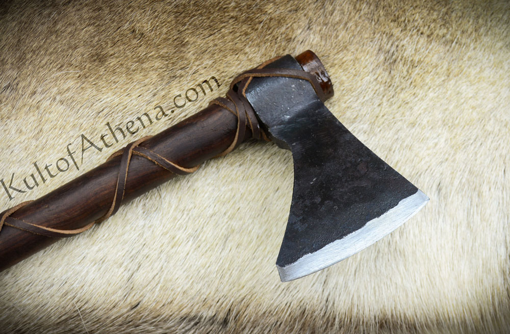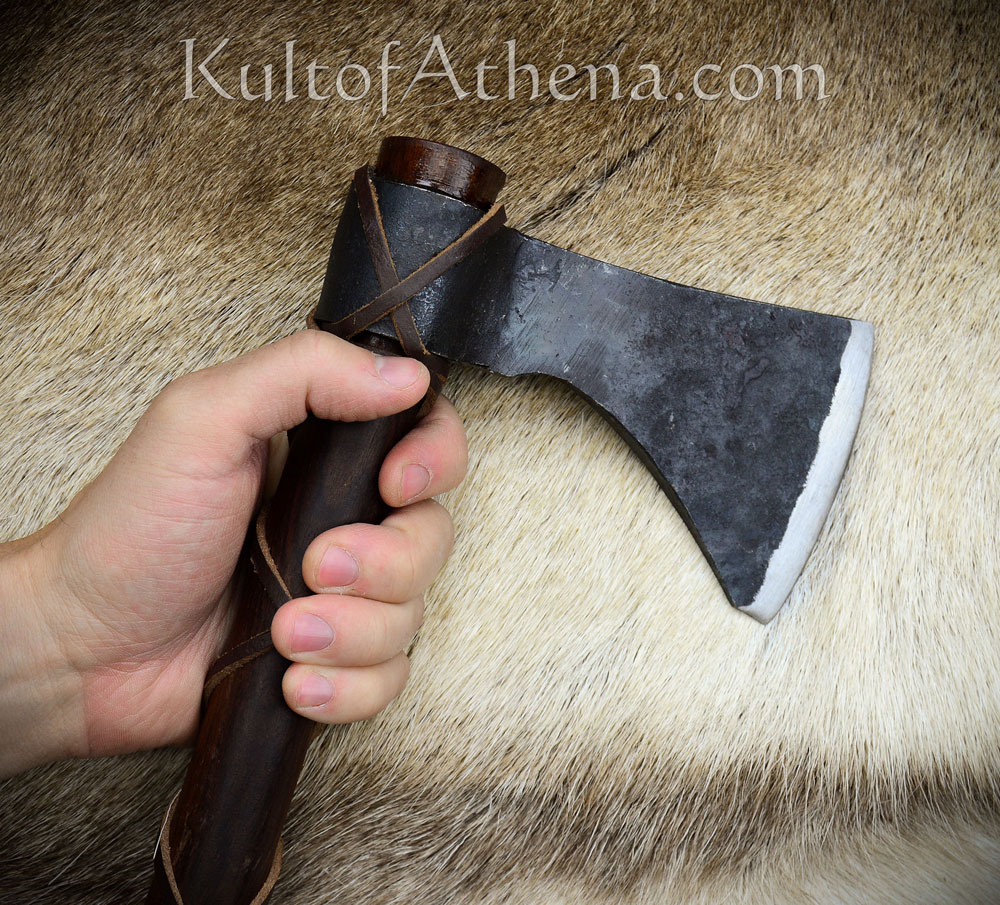 Not Bad! I got this axe from KOA a week or so ago. I didn’t want to spend too much on a axe, so this seemed like it might be a favorable option. I would have preferred it to be a bearded axe, but I guess there are other axes that cover that. That cutting edge of the axe didn’t come sharp, but a put the accu-sharp to it and now it’s paper cutting sharp. It’s not like I’m gonna be cutting down trees with it, but I do like to have this kinda stuff at least reasonably sharp. All in all this isn’t to bad, the head does have a slight wiggle to it, but that’s an easy enough fix. The leather wrap is ok, but it’s certainly not super quality leather, it still has a cool look to it though. I’ll give it 4 stars, because it does fit in with all my other Viking gear. Kinda fun to binge watch Vikings while having a few Viking tools handy for added effect.