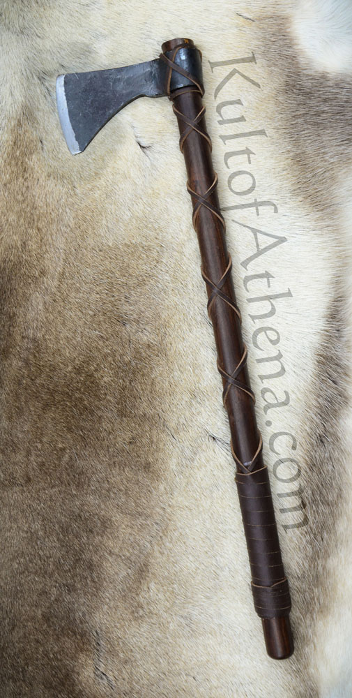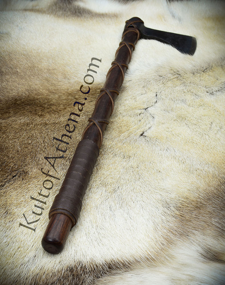 The Ragnar Viking Axe has an axe head forged from high carbon steel which is fitted to a wooden haft. The head has been reinforced with glue and the axe was finished with a leather grip and leather lattice-work binding upon its haft and head.