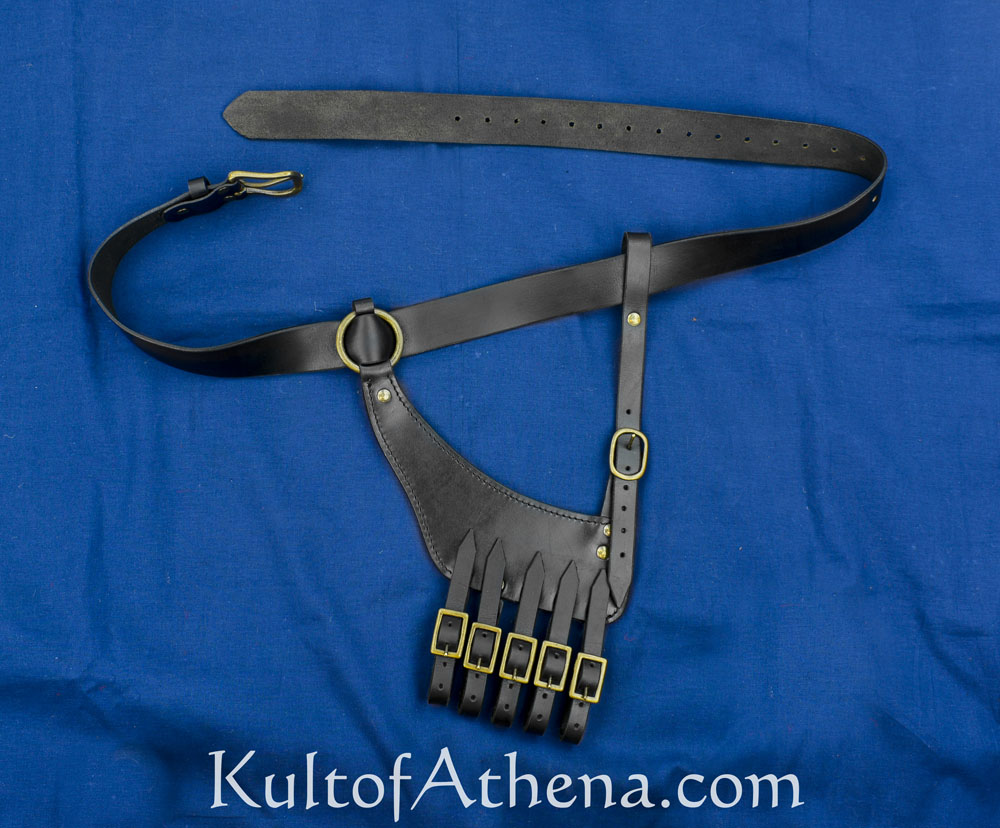 This adjustable belt with rapier frog is crafted from thick, stitched leather. The buckles, rivets and fittings are of steel. The frog has a series of adjustable buckles and straps that can be fitted to a rapier scabbard; another buckle and strap on the frog can be used to control the angle the sword hangs at.