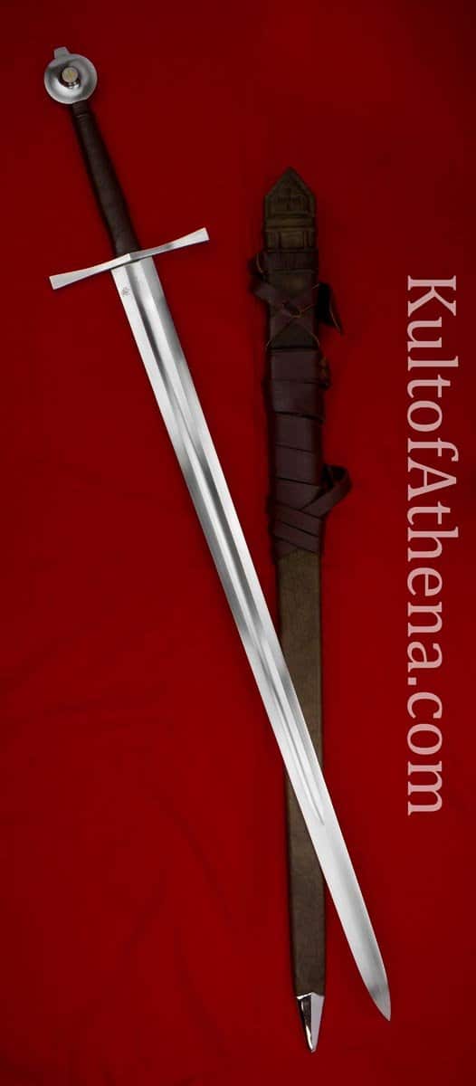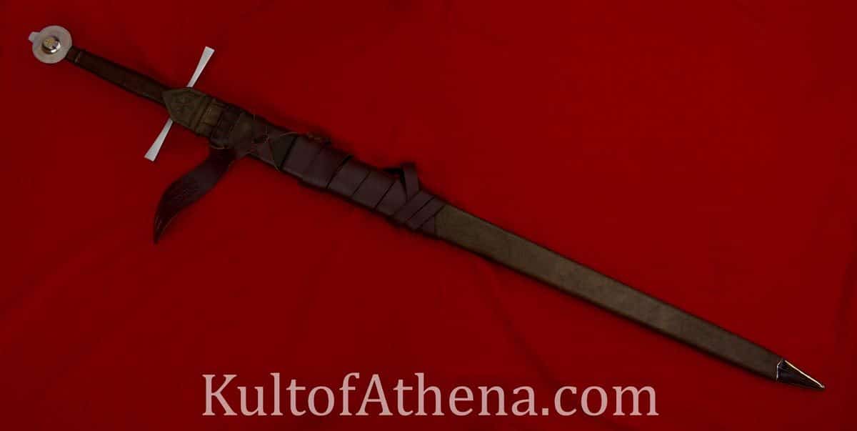 This reproduction has a blade forged from EN42J high carbon steel which has a tempered hardness of 45 HRc (approx) with its edges hardened to 50 HRc (approx). The large and broad blade was designed for sweeping blows and powerful cutting strikes from a professional warrior. The guard and pommel are crafted from steel and the pommel has an inlaid brass cross on both sides. The sword is durably mounted into the hilt with a solid peen over a pommel block and the sword is finished with a wooden grip which is bound in leather.