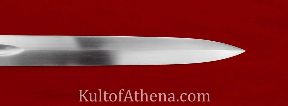 The sword comes with a wooden scabbard which is overlaid in matching leather. The protective chape is steel and the integrated sword belt is of leather. The scabbard is embellished with the Cross Pattée of the Templar Order and the motto “In Nomine Domini” (In the name of the Lord).