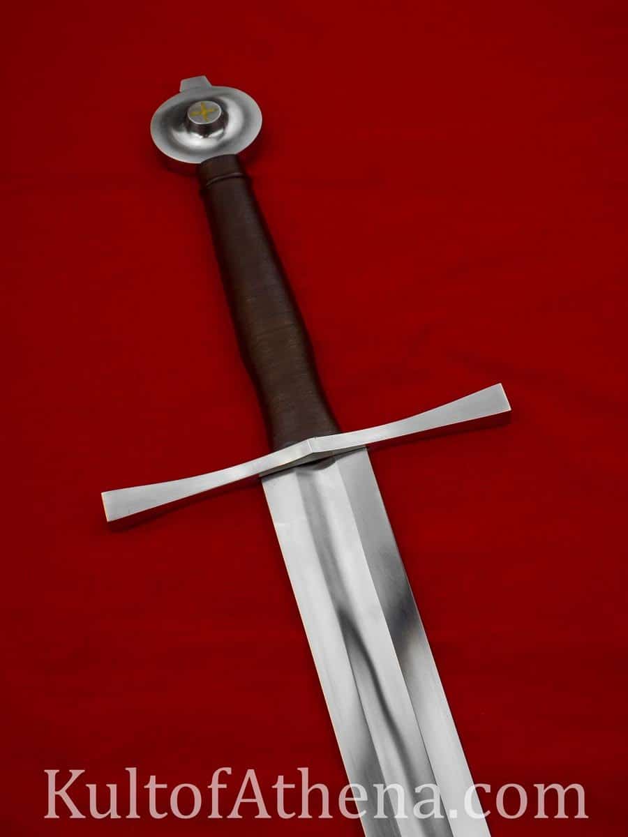 The Temple Church sword from Red Dragon Armoury is a reproduction of a sword that was found in the River Thames in the vicinity of the Temple Church in London – the headquarters of the Knight’s Templar in England. The original was likely created in the first half of the 14th century and its date and the location of its founding make it possible that the sword was hurled into the river after the dissolution of the Order of the Temple by Edward II in 1314. A finely crafted sword, it has some markings that match a different, but similar sword made for Edward III; an inlaid brass cross in the pommel and a sword-shaped maker’s mark inscribed into the fuller on a single side. It seems likely that Edward III’s sword came from the same maker or workshop that created the Temple Church Sword.